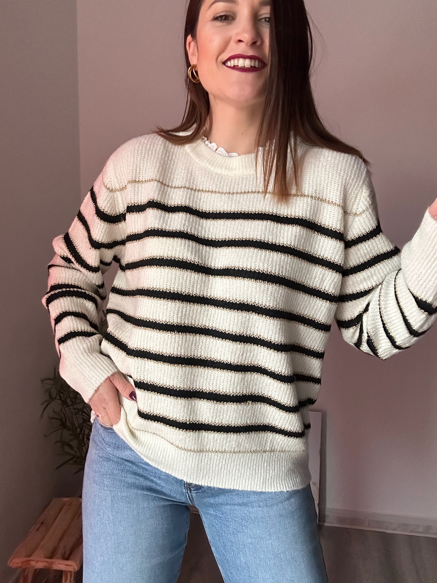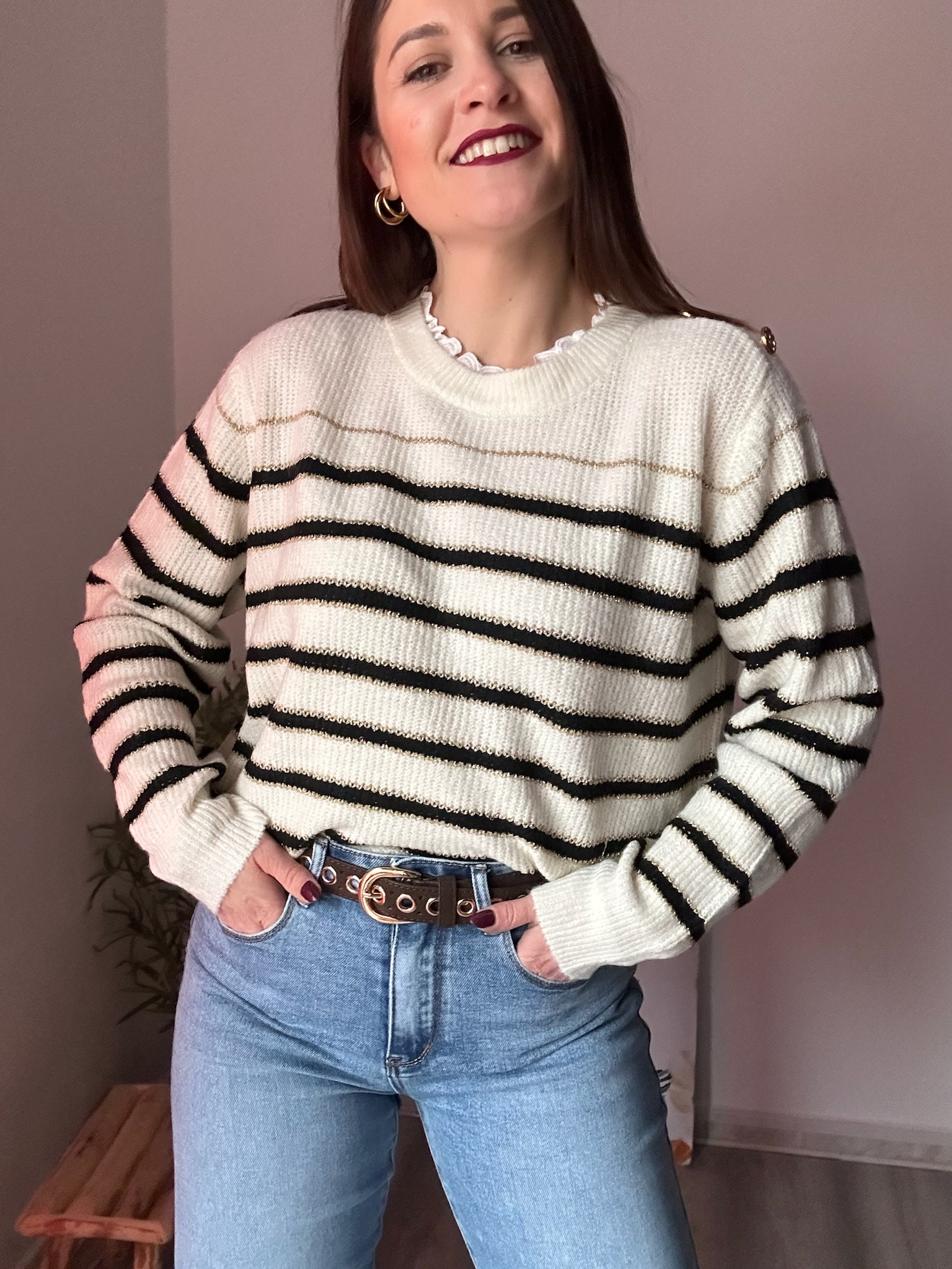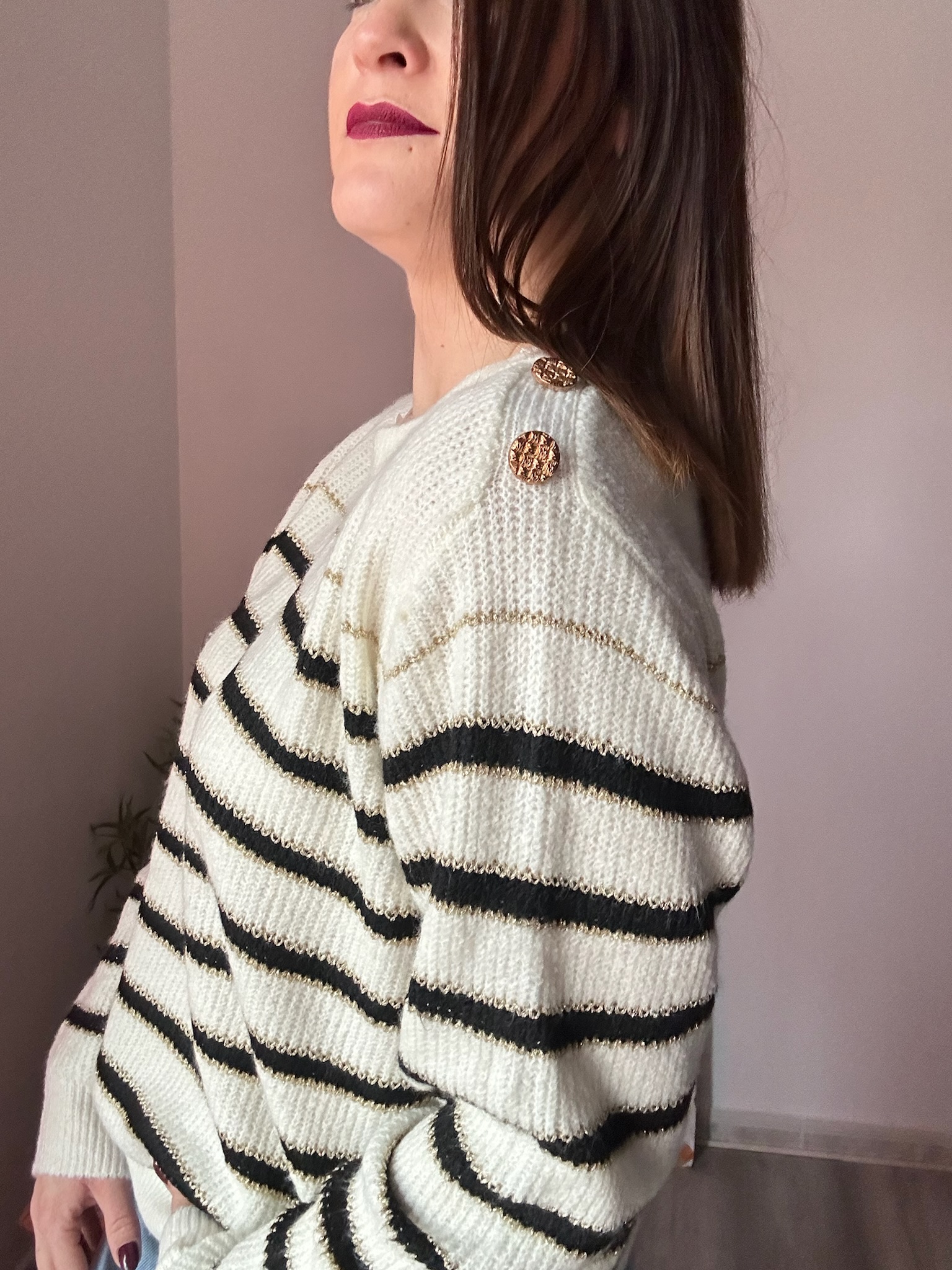 El jersey de rayas con puntilla en el cuello de La Boutique de Virgo es una prenda femenina y elegante, ideal para mujeres que buscan comodidad, estilo y detalles delicados en su vestuario diario. Su diseño combina la atemporalidad de las rayas con un toque romántico gracias a la puntilla en el cuello, aportando un acabado especial y distinguido. Las rayas son doradas con brillo, y negras. Cuenta con dos botones dorados en el hombro.