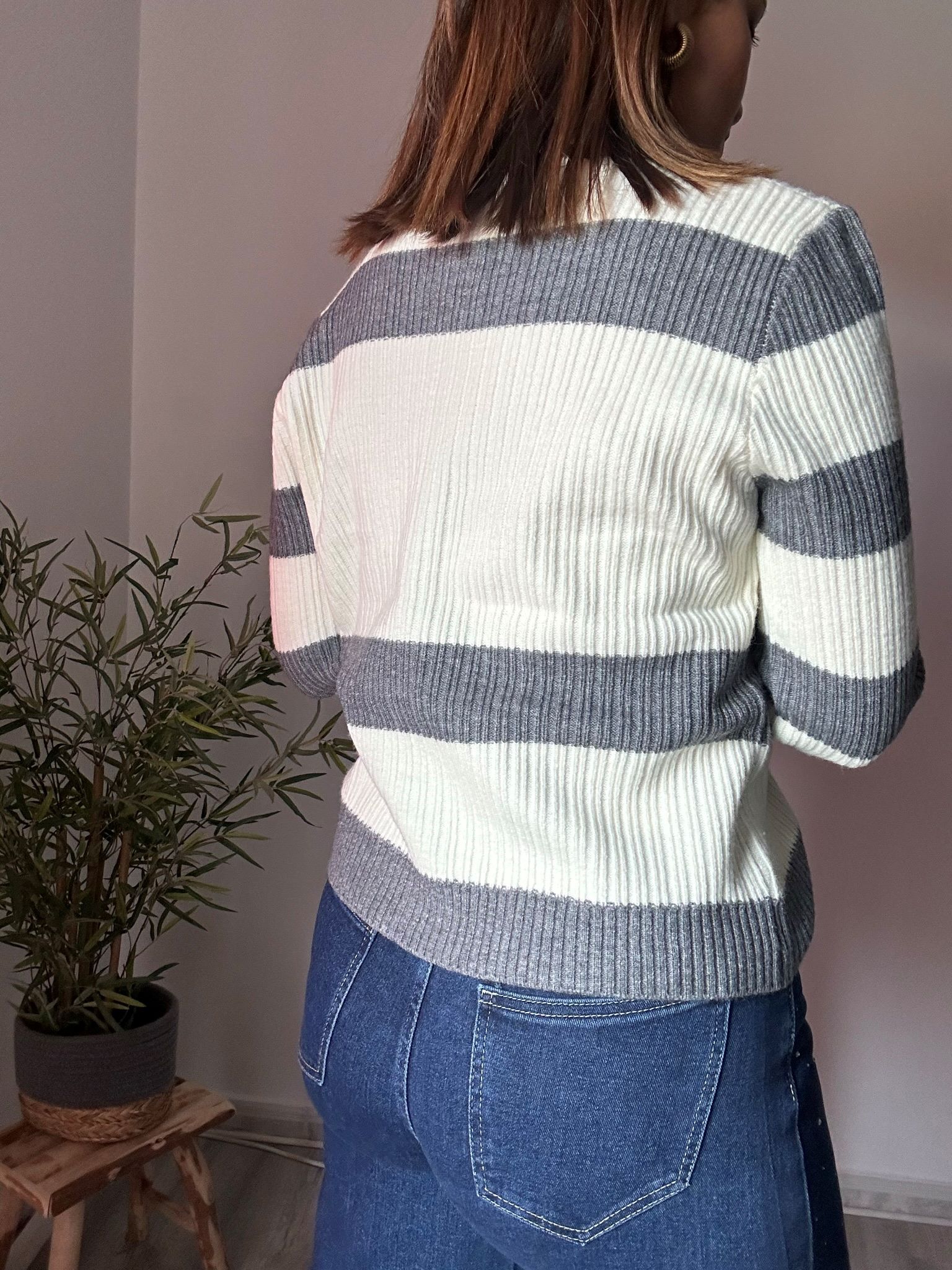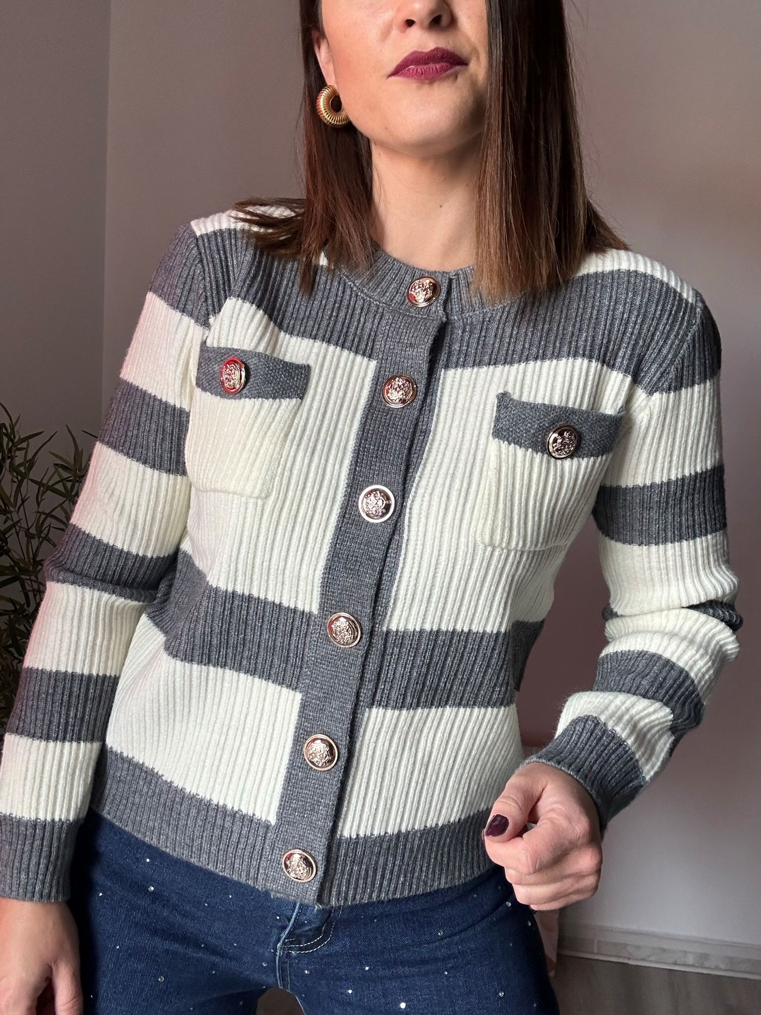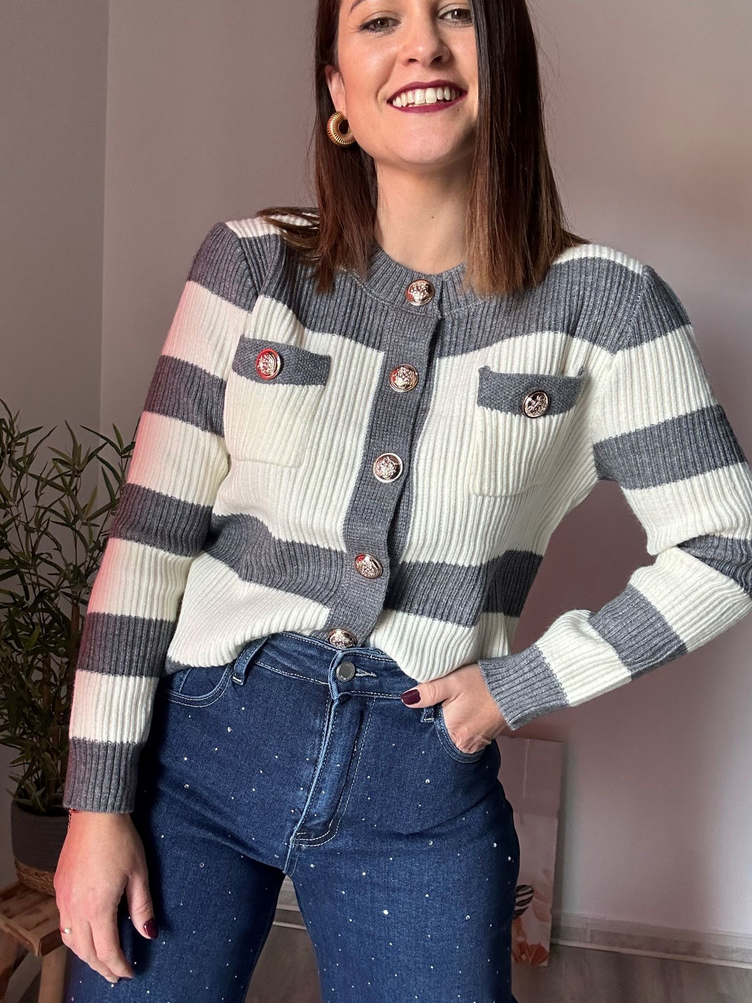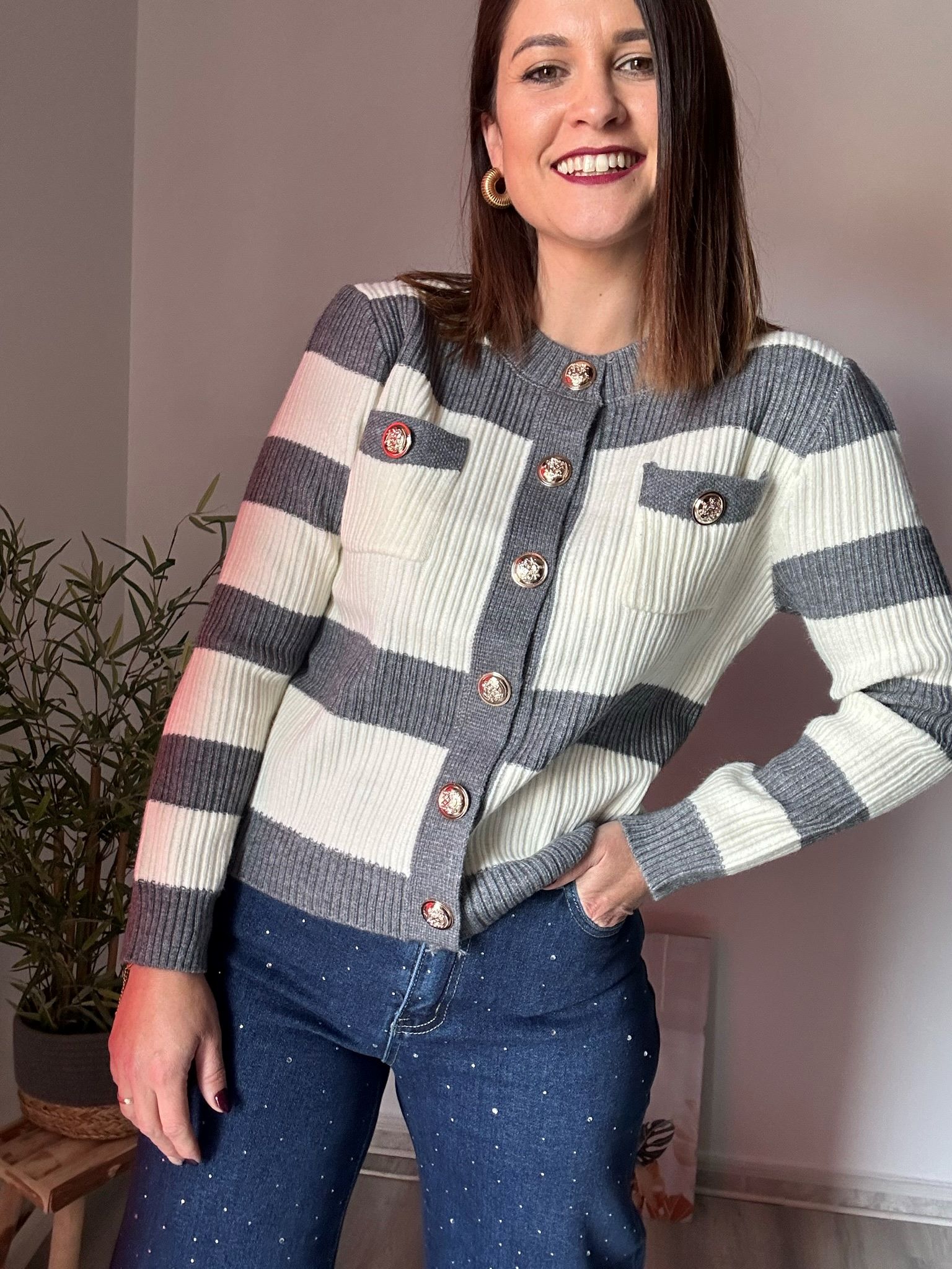 Aporta un toque elegante y versátil a tu look con este jersey tipo rebeca a rayas grises y blancas de La Boutique de Virgo. Su diseño combina la comodidad de una prenda básica con los detalles sofisticados que marcan la diferencia. Confeccionado en un tejido suave y agradable al tacto, ofrece una caída ligera perfecta para cualquier ocasión, desde un paseo informal hasta una jornada de oficina.