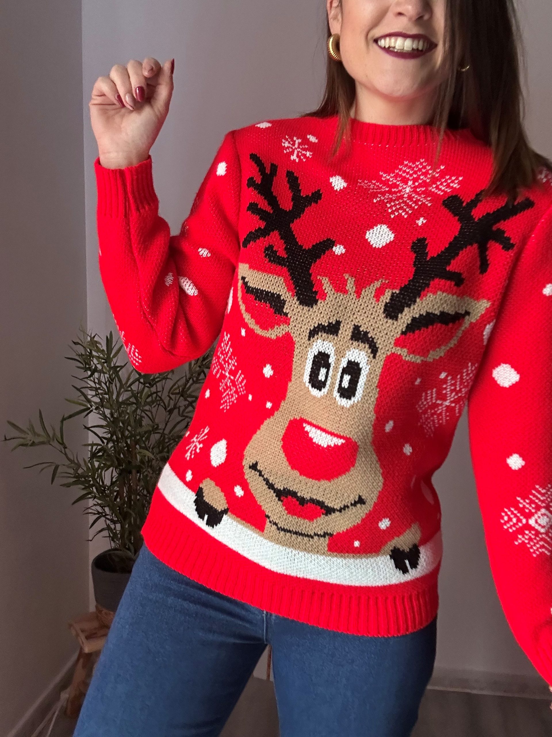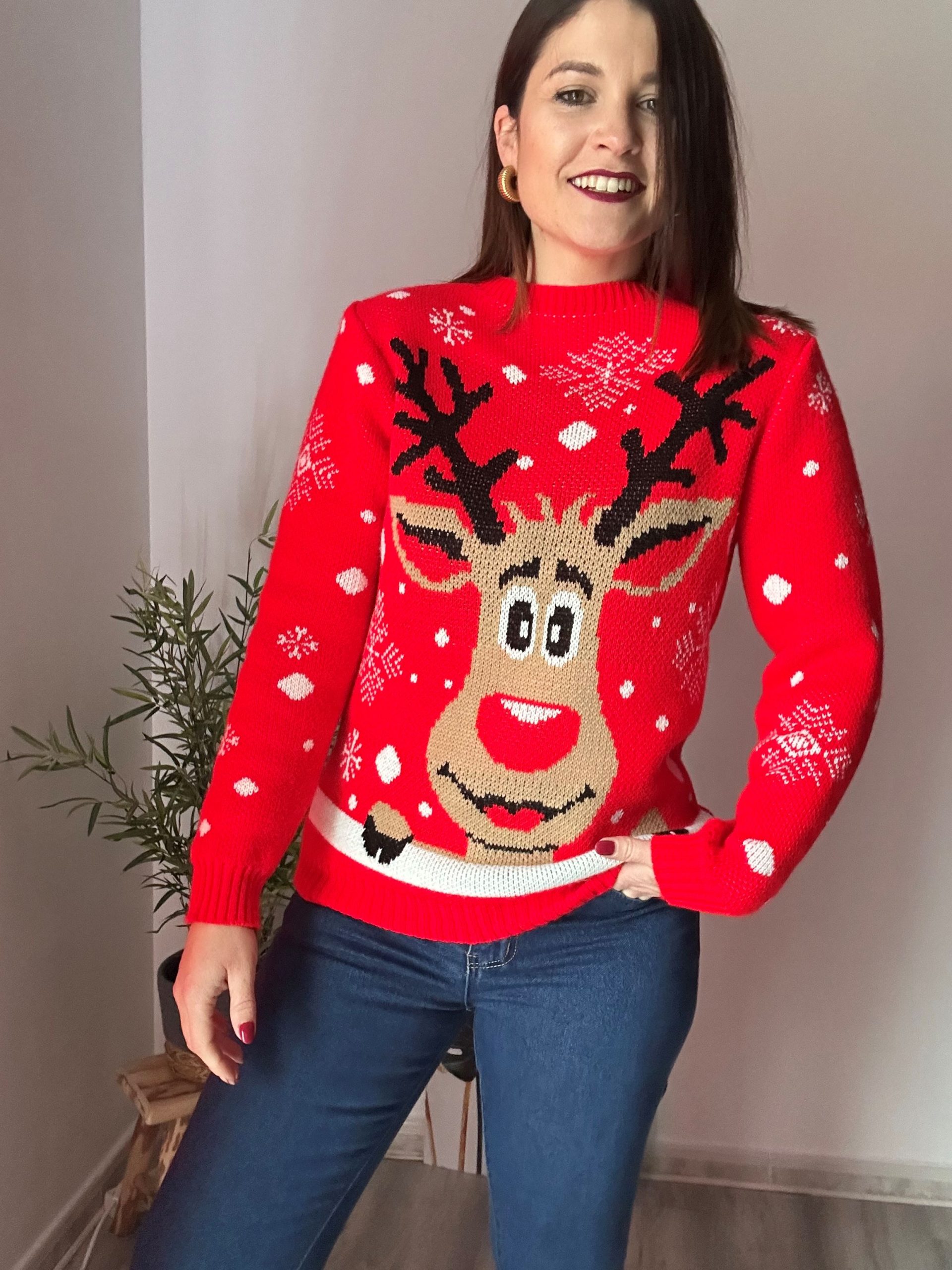 Jersey Reno mujer. Colección de jerséis navideños rojos con estampados festivos divertidos. Tejido suave y calentito de 85% acrílico y 15% nylon.