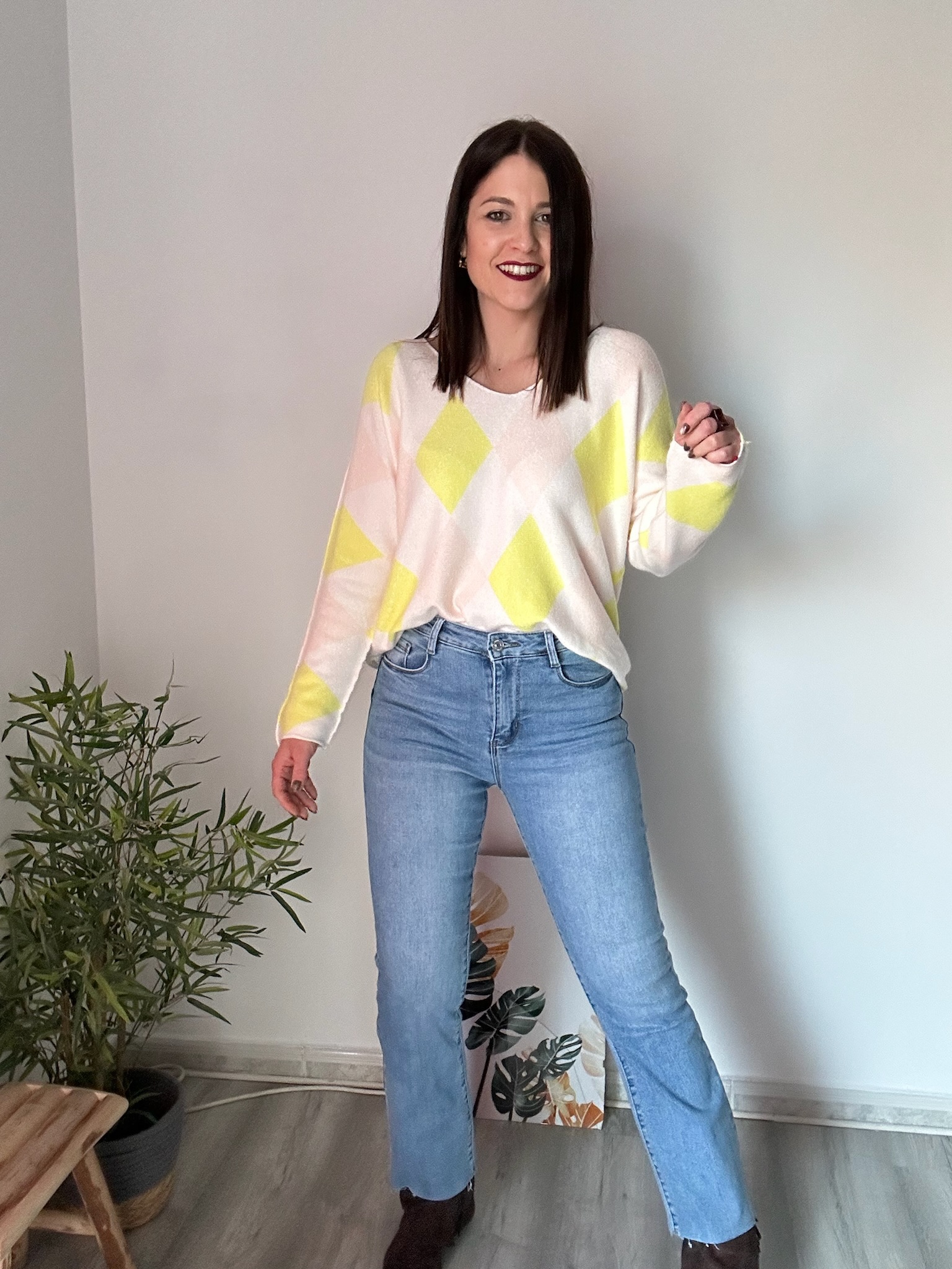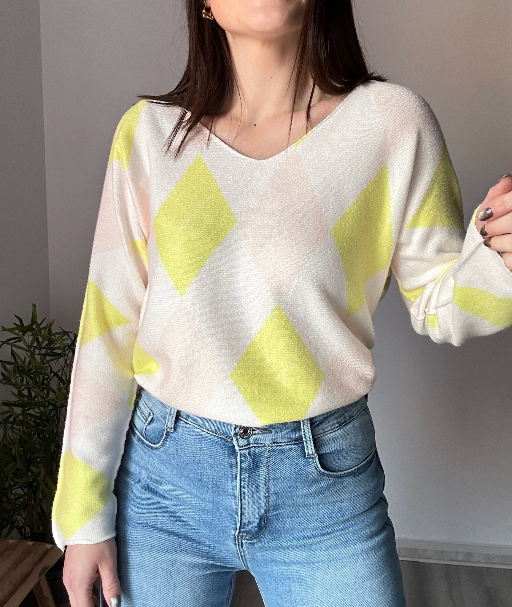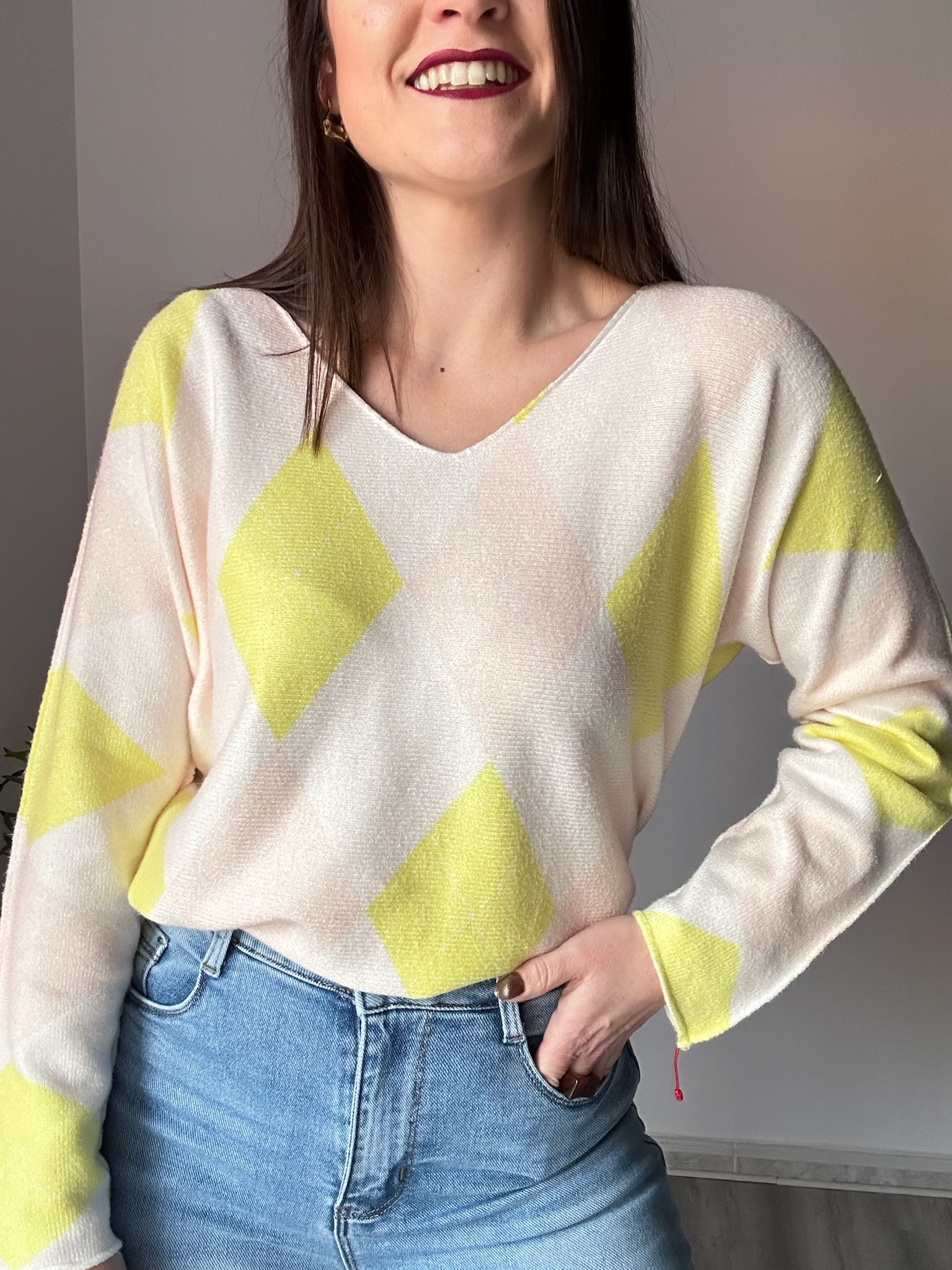 Este jersey de rombos para mujer en color amarillo es una prenda ideal para aportar luz y estilo a cualquier look. Su diseño combina tendencia y comodidad, convirtiéndolo en una opción perfecta tanto para el día a día como para ocasiones más especiales. El escote ligeramente a pico estiliza el cuello y el escote, aportando un toque femenino y elegante sin resultar excesivo.