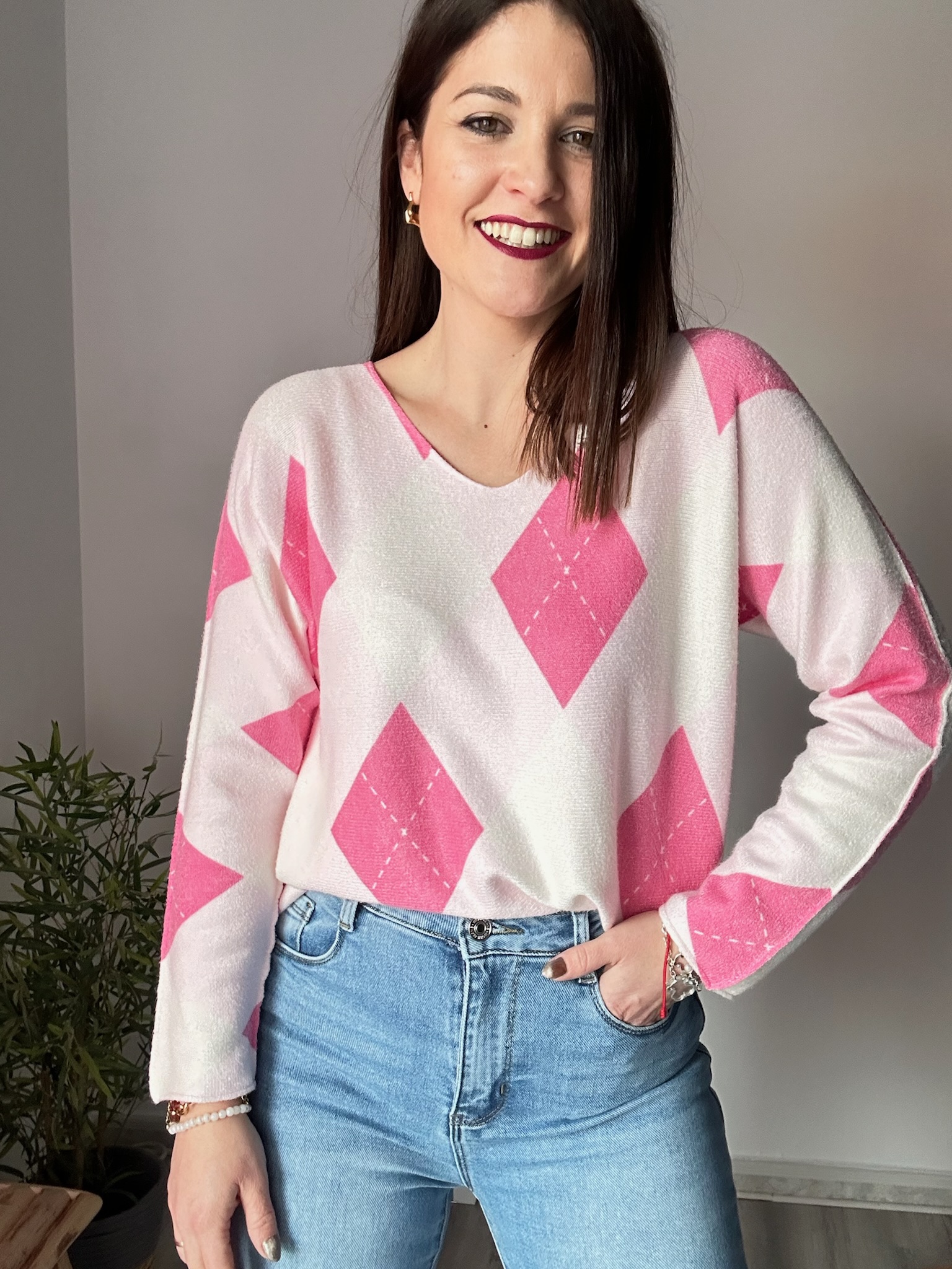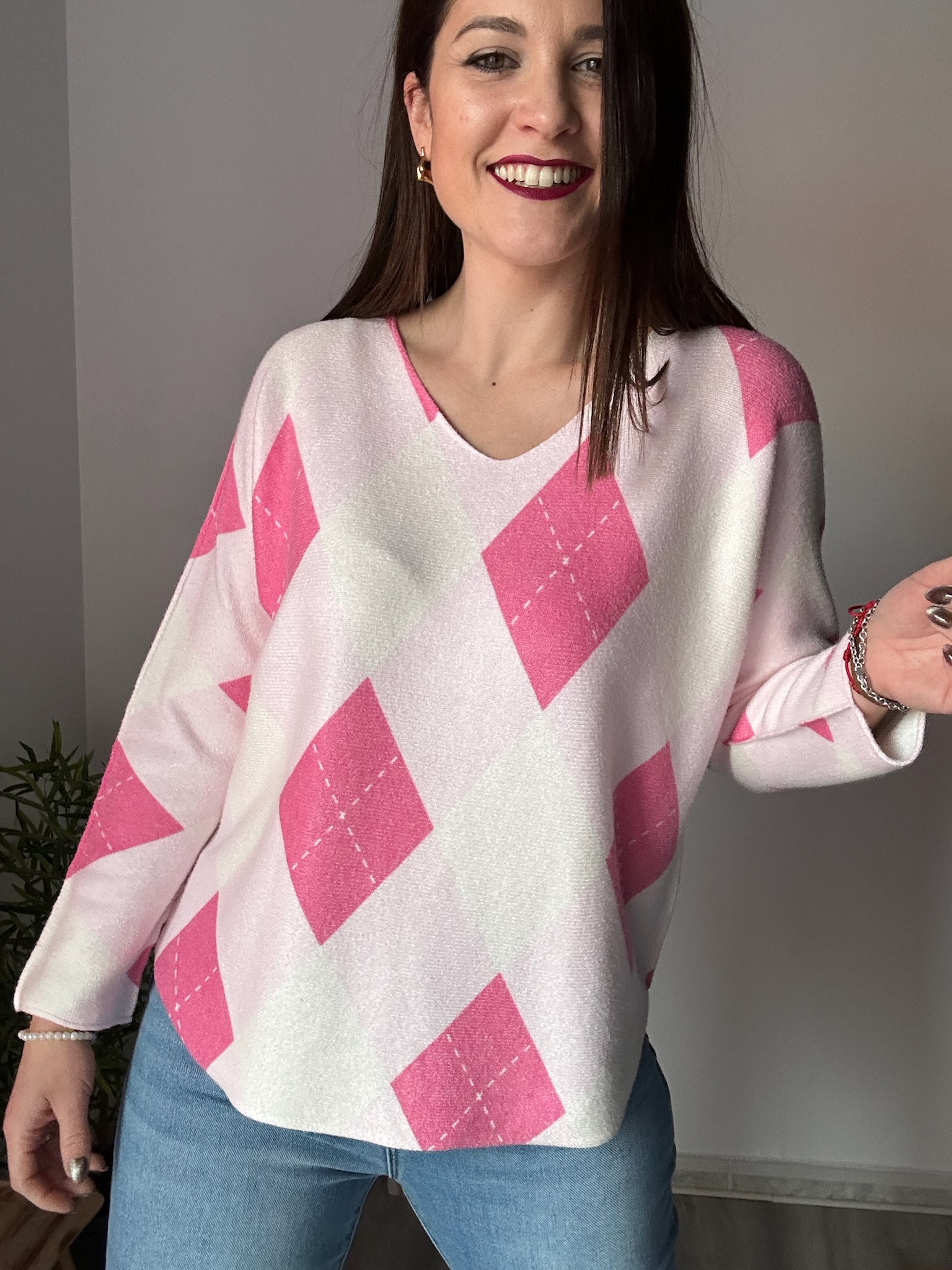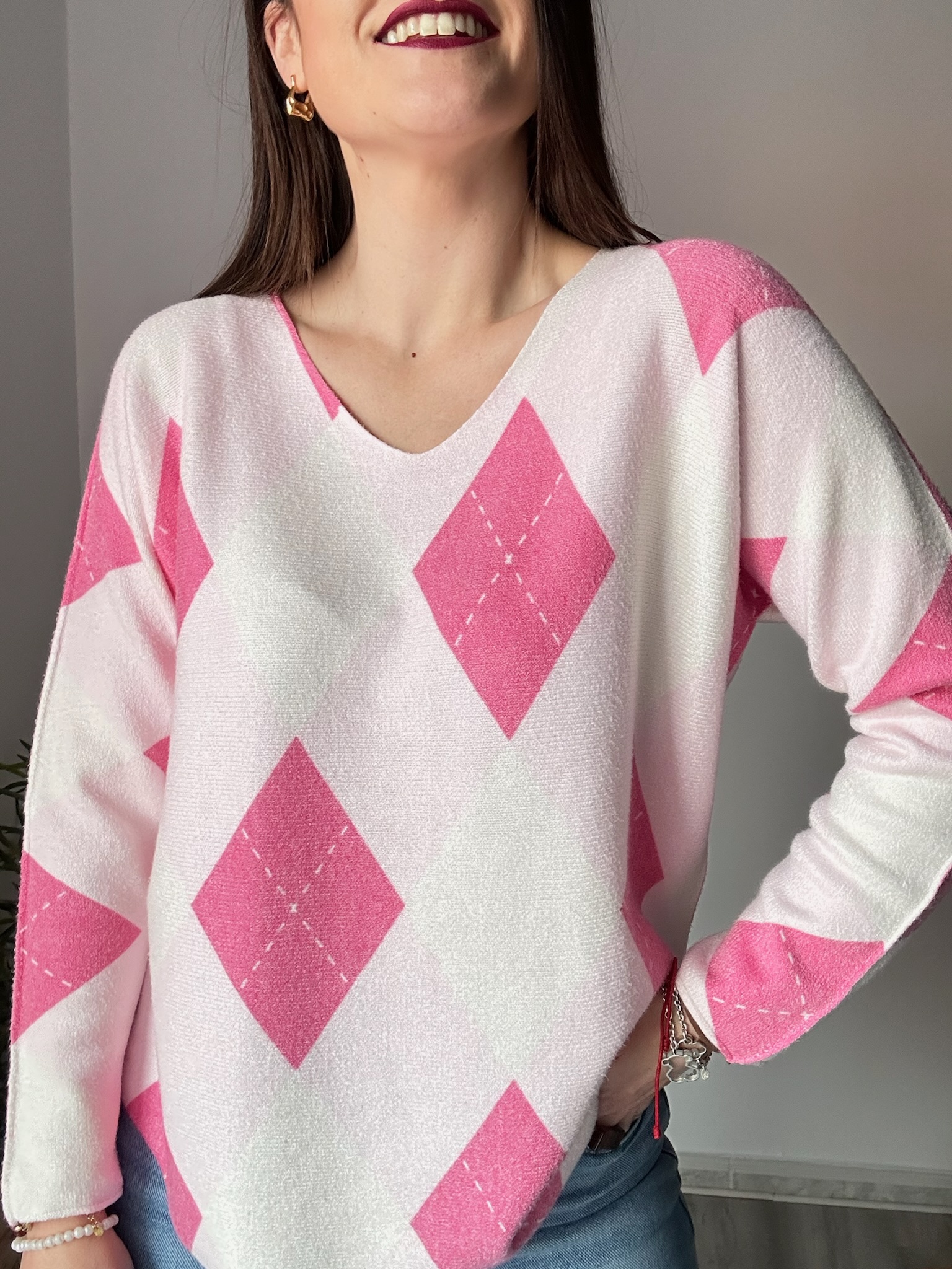 Jersey de rombos en color rosa con escote ligeramente a pico. Confeccionado en tejido suave y gustoso, cómodo y favorecedor. Talla única, recomendado para tallas 36 a 44. Ideal para looks luminosos y femeninos en cualquier temporada.