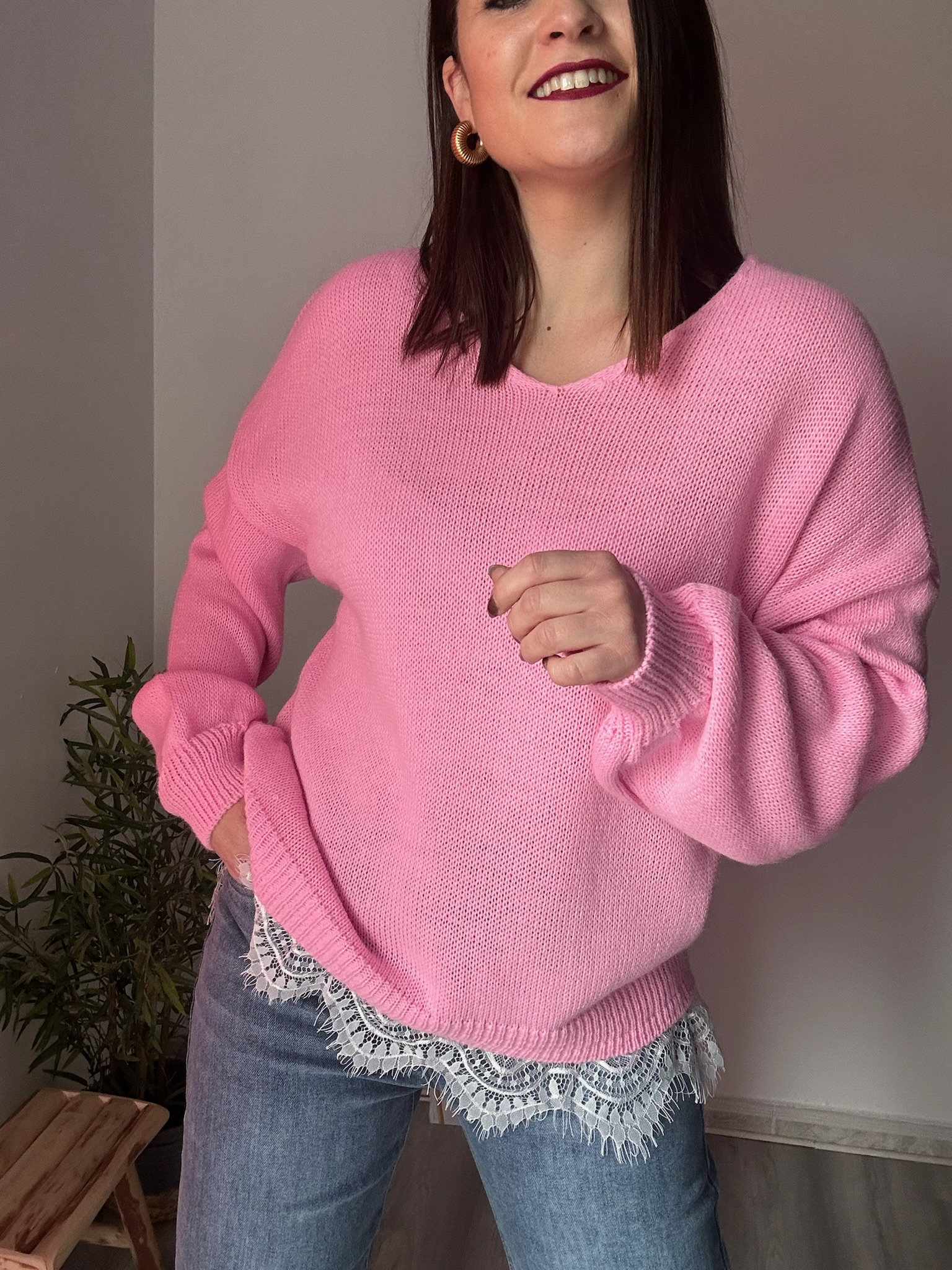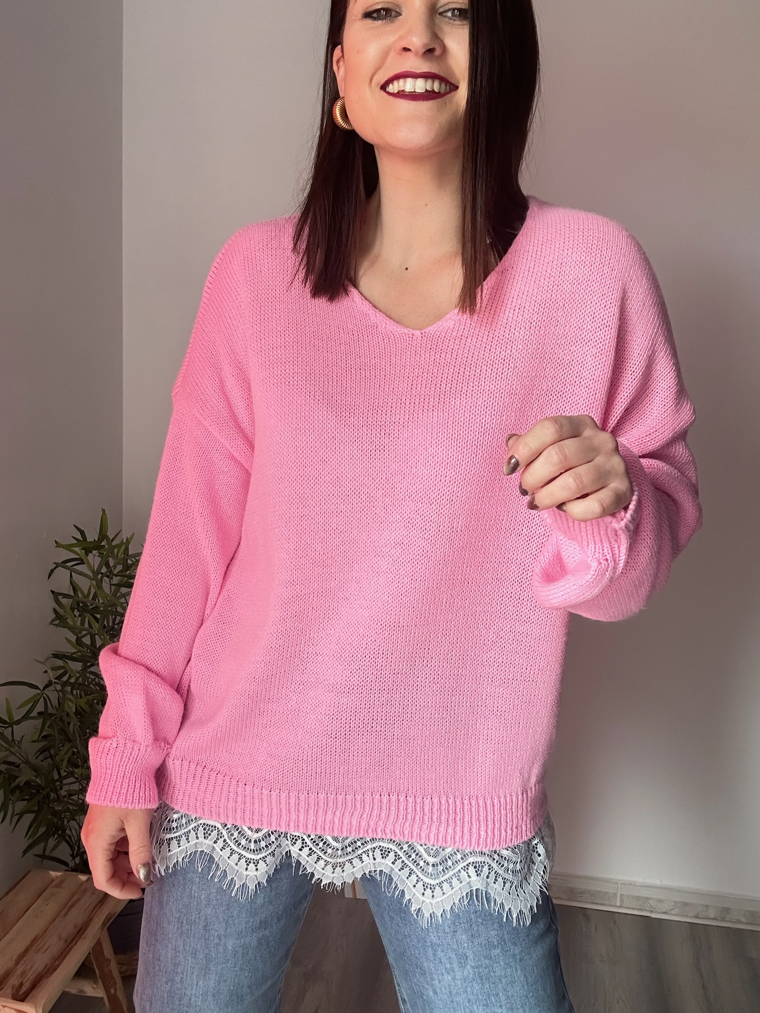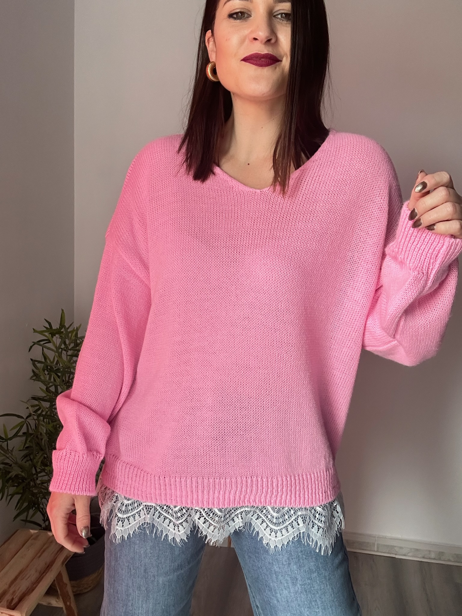 El escote suave en pico estiliza la zona del cuello y realza la silueta de forma discreta, mientras que el encaje blanco en el bajo añade un acabado romántico y sofisticado que marca la diferencia. Este detalle convierte el jersey en una pieza perfecta tanto para looks diarios como para conjuntos más cuidados.