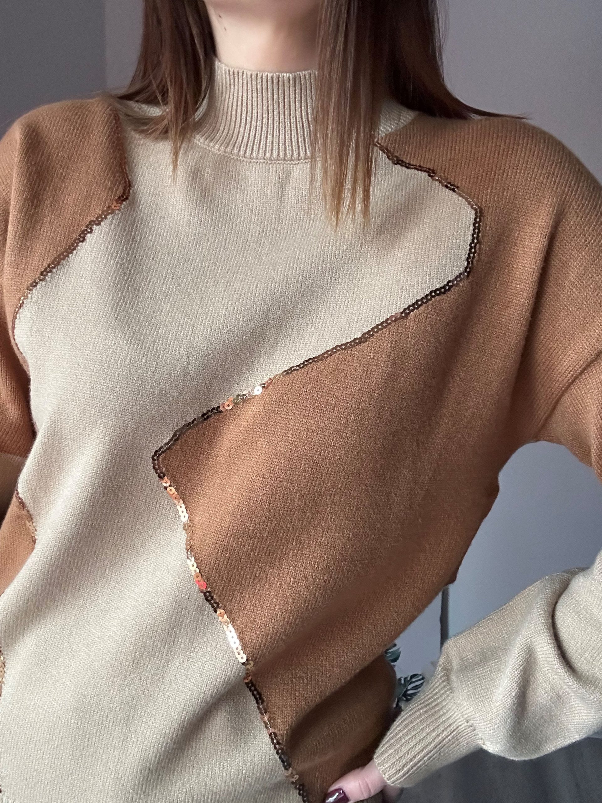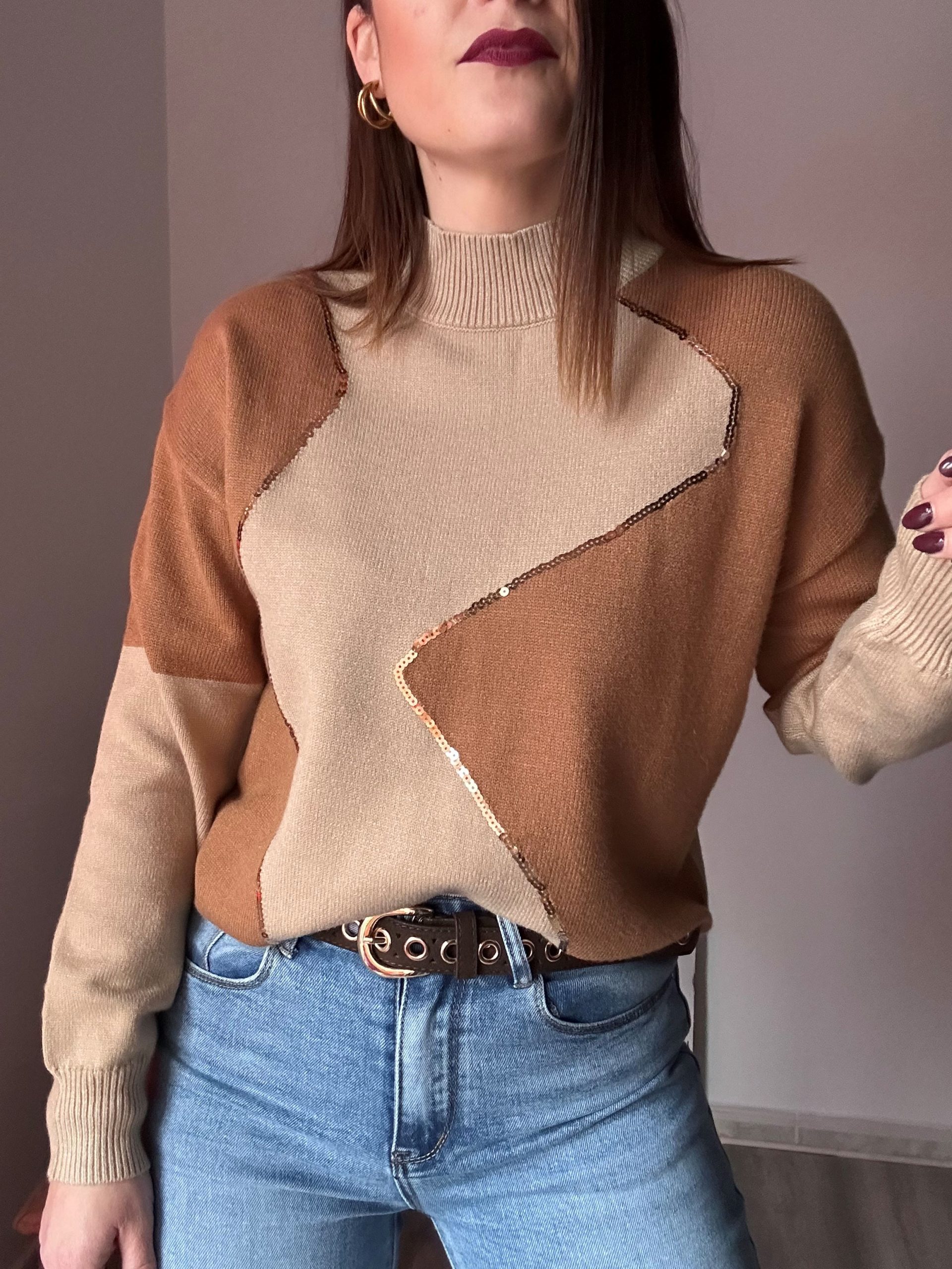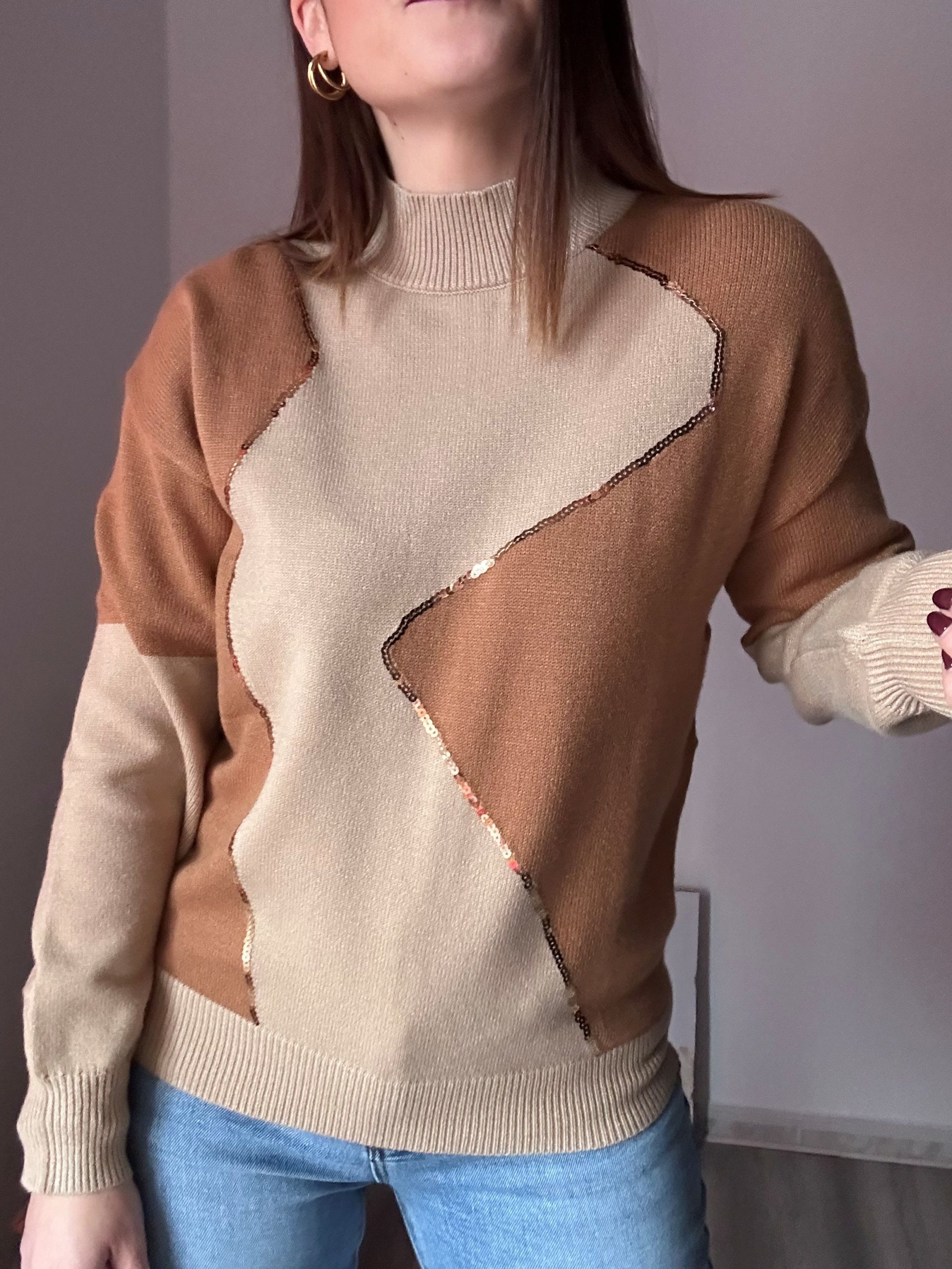 Jersey en tonos camel y marrón con elegante detalle de lentejuelas y cuello cerrado. Su tejido suave lo hace cómodo y calentito.