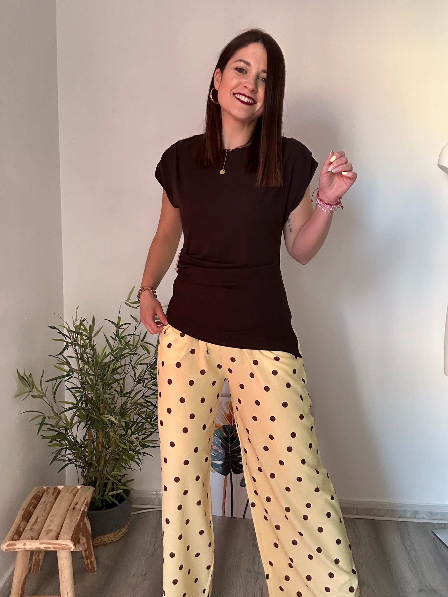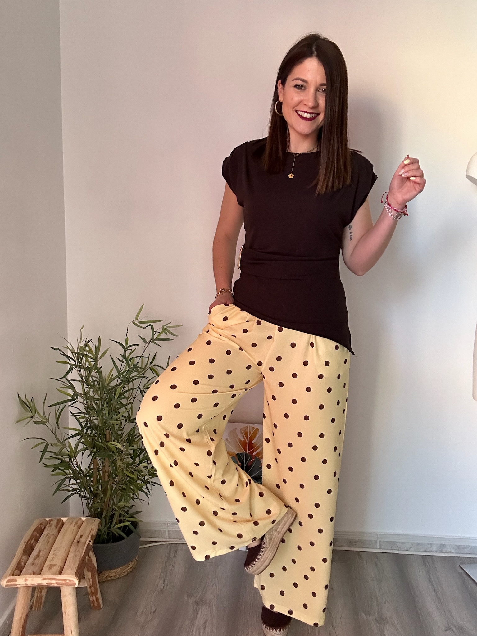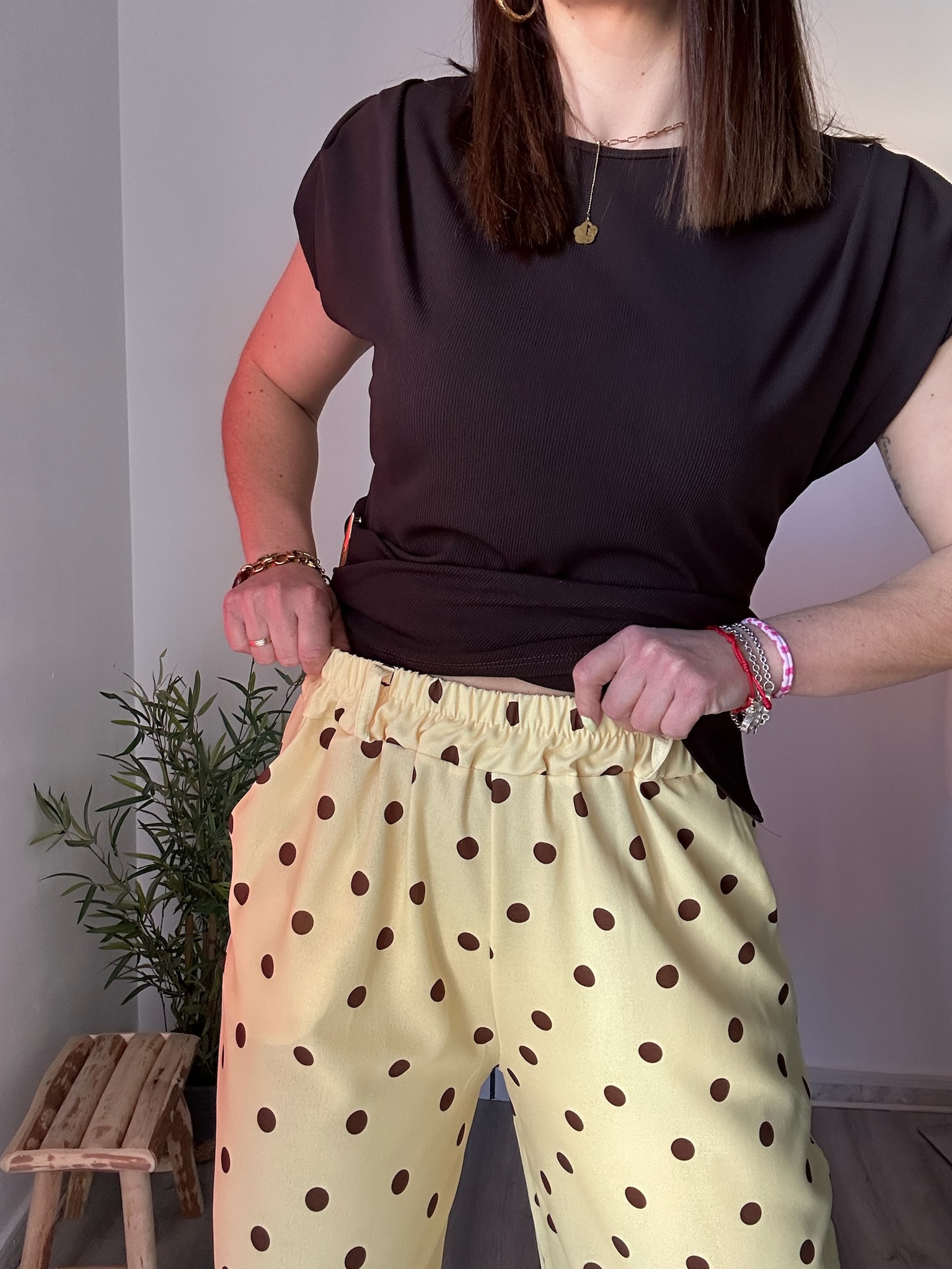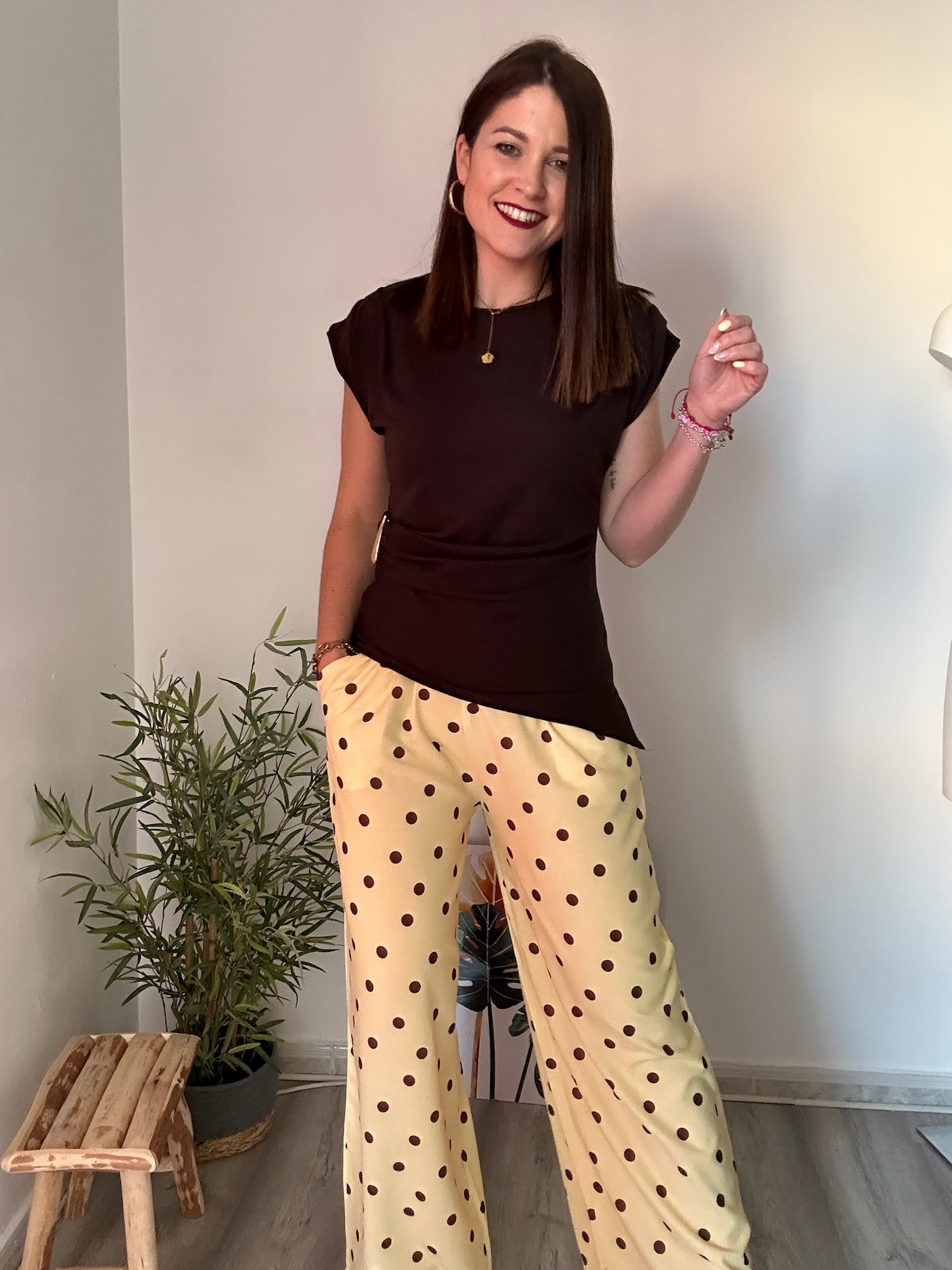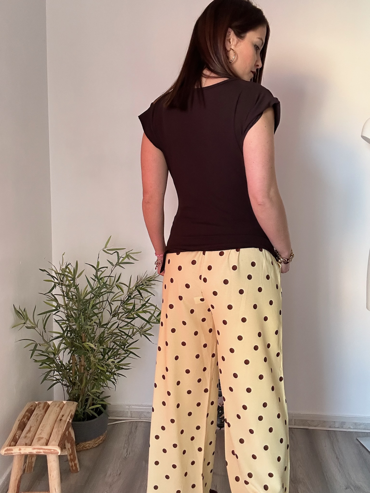 El pantalón fluido amarillo con lunares marrones de La Boutique de Virgo es una prenda perfecta para aportar color, frescura y estilo a tus looks. Su corte fluido ofrece una caída ligera y elegante que estiliza la silueta, ideal para el día a día o para ocasiones más especiales.