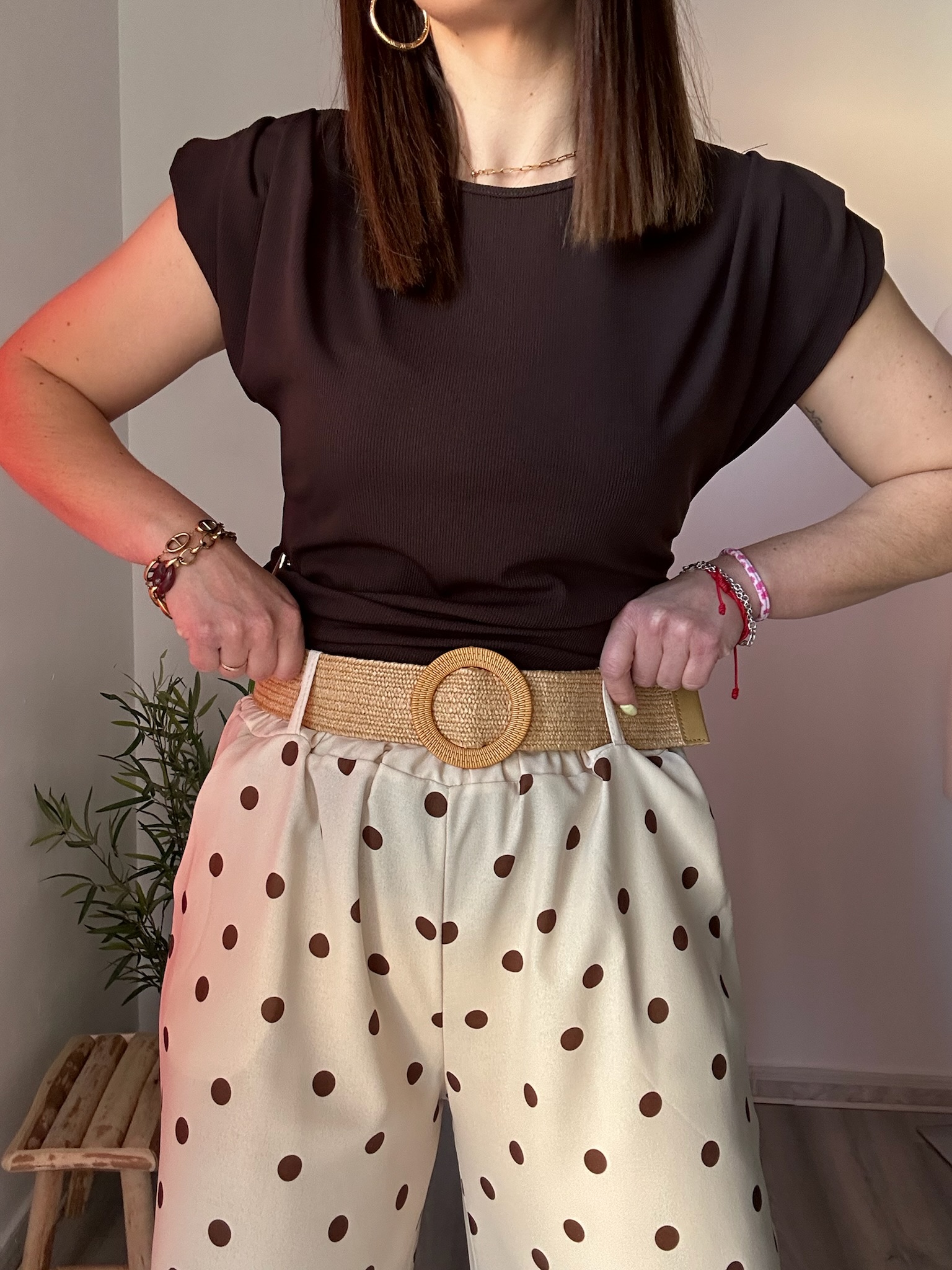 El pantalón fluido beige con lunares marrones combina elegancia y comodidad. Con cintura elástica y bolsillos laterales, ofrece un ajuste perfecto. Su tejido ligero lo hace ideal para looks versátiles. Talla única recomendada de la 36 a la 42.