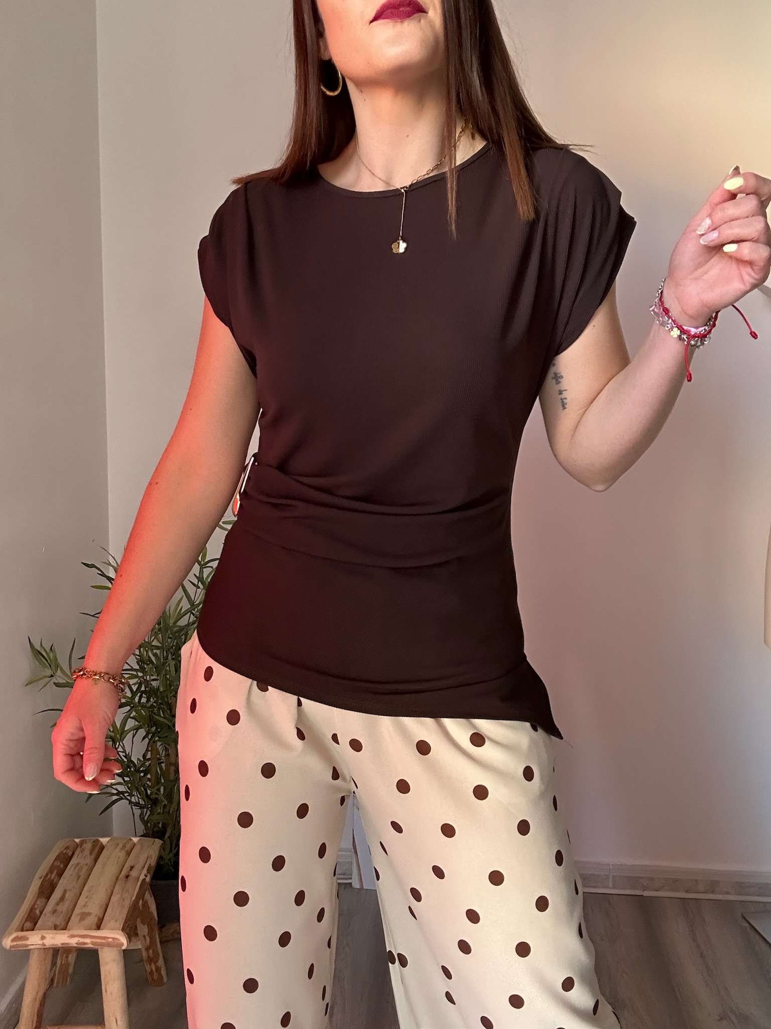 El estampado de lunares en tono marrón sobre fondo beige añade un toque clásico con un aire moderno, fácil de combinar con prendas básicas o más sofisticadas. Este diseño versátil permite crear looks frescos, femeninos y actuales.