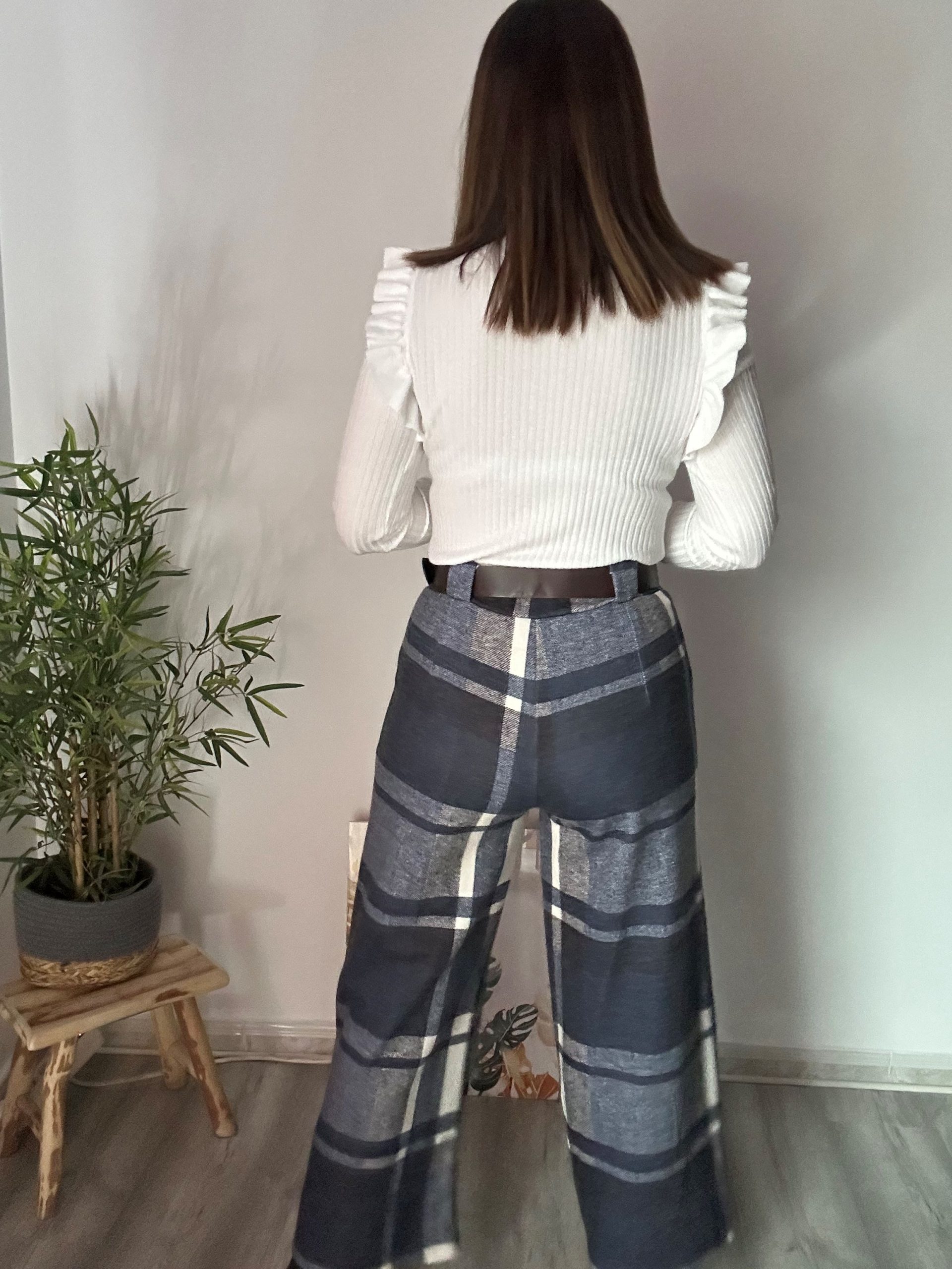 El pantalón de corte recto de cuadros es una prenda versátil y elegante que combina diseño clásico con un toque actual. Su estampado de cuadros en tonos azules, beige, negro y gris aporta un aire sofisticado y fácil de combinar, convirtiéndolo en una opción ideal para looks de diario o estilismos más formales.