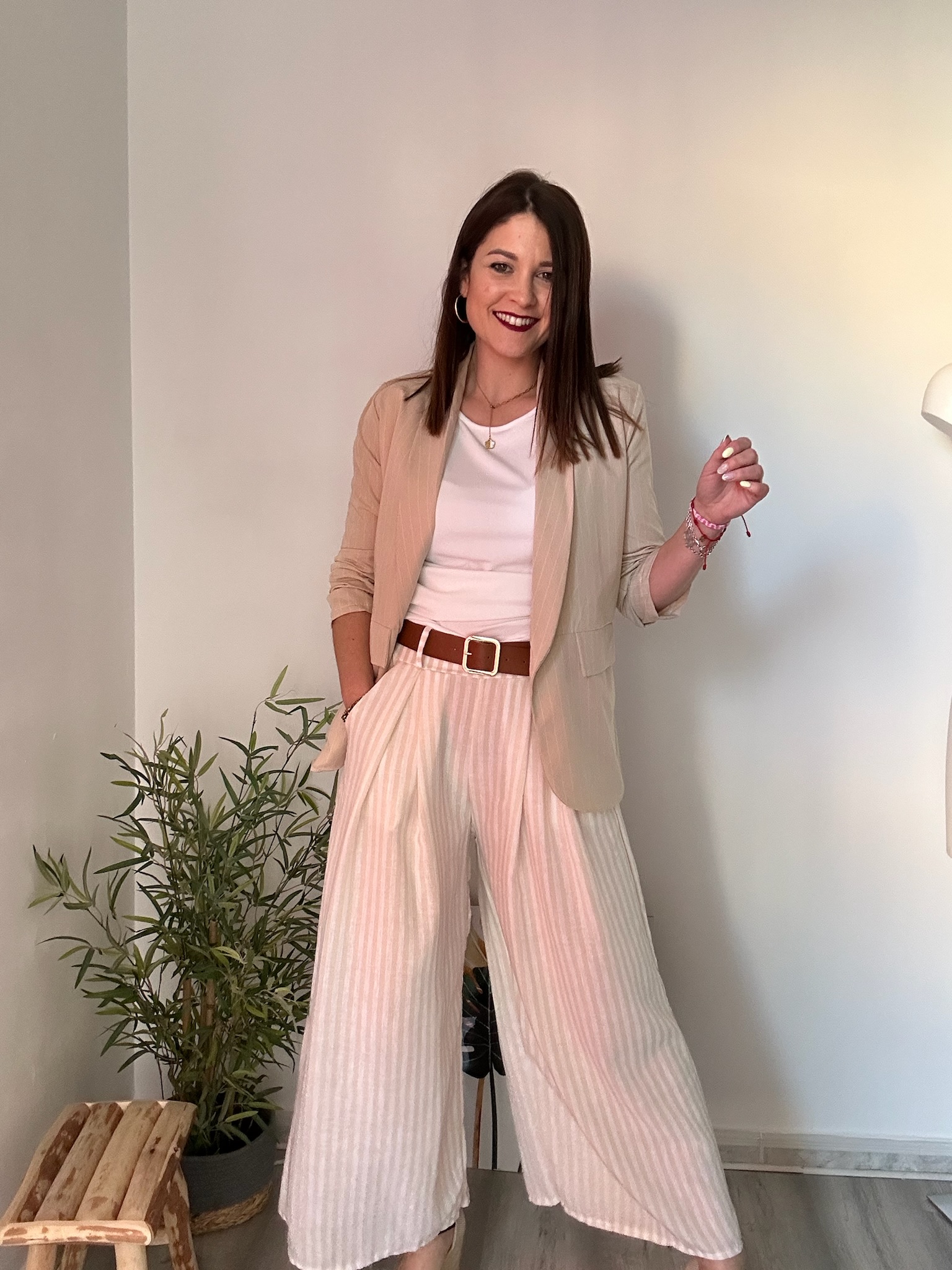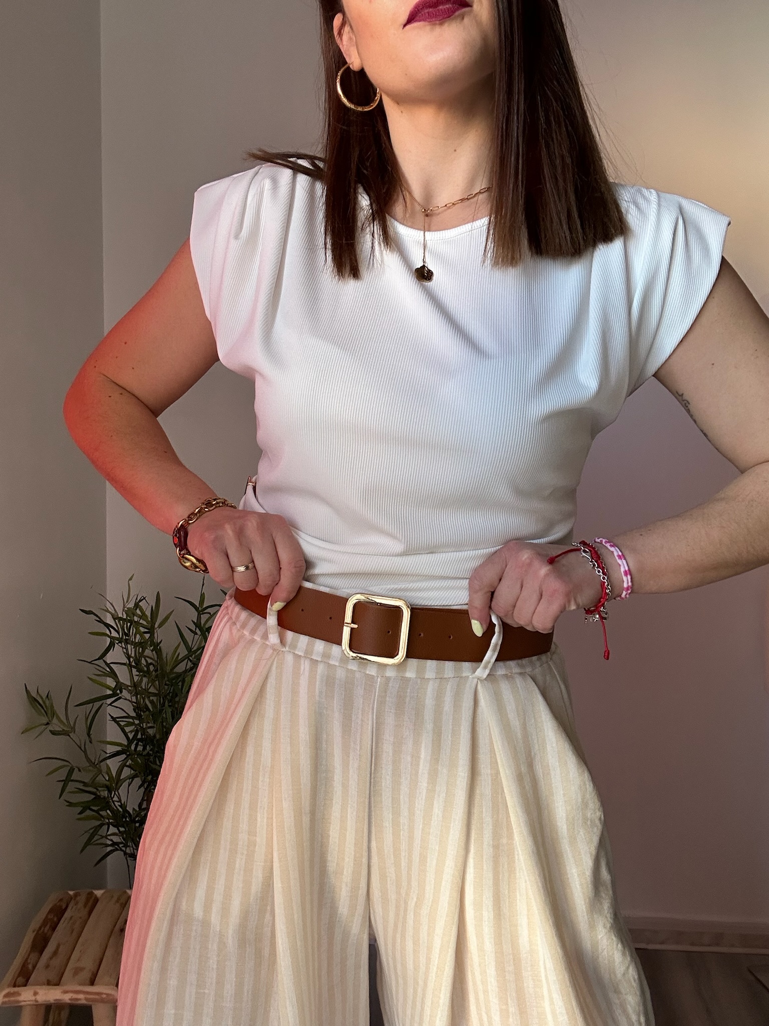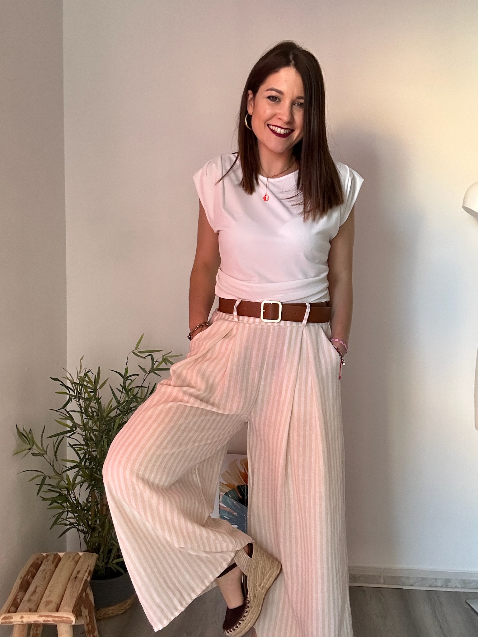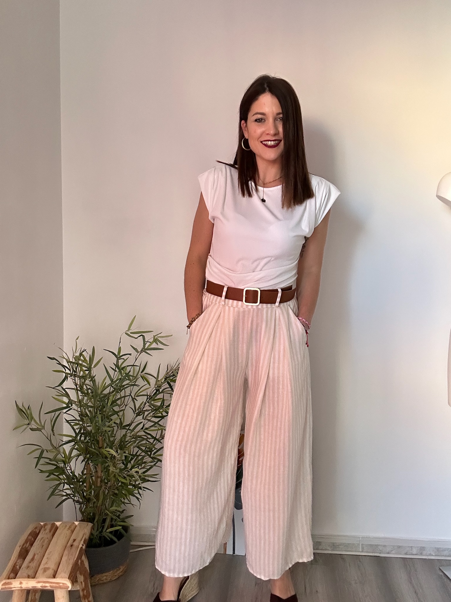 El diseño de rayas en tonos blanco y crudo aporta luminosidad y versatilidad, permitiendo múltiples combinaciones con prendas básicas o más elegantes. La cintura elástica con goma garantiza un ajuste cómodo, mientras que el cinturón marrón incluido añade un detalle extra que realza el conjunto y define la cintura.