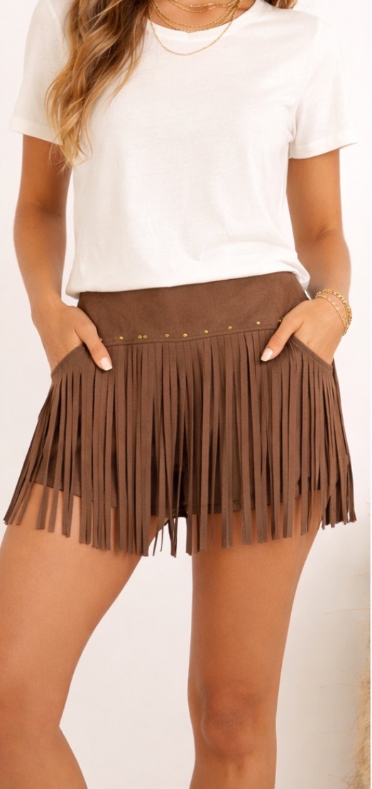 Confeccionado en un suave tejido efecto ante, aporta un acabado elegante y muy agradable al tacto. Su diseño incorpora detalles de flecos en la parte delantera, creando movimiento y un aire boho sofisticado ideal tanto para el día como para la noche. La parte trasera es lisa, sin flecos, lo que equilibra el diseño y estiliza la silueta.