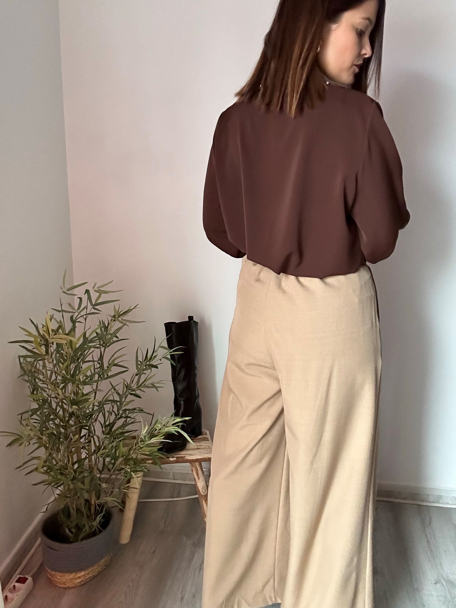 El pantalón en color camel con pinzas y pernera ancha es una prenda versátil, elegante y con ese toque sofisticado que nunca pasa de moda. Su diseño combina comodidad y estilo, convirtiéndose en una pieza imprescindible para cualquier fondo de armario.