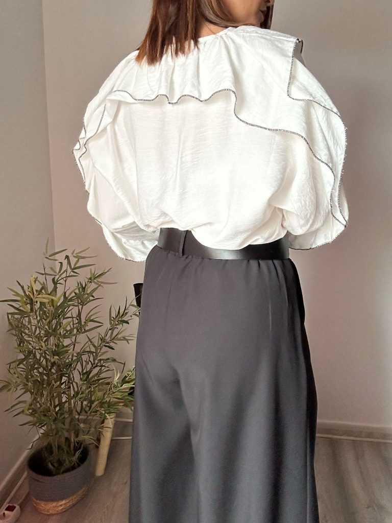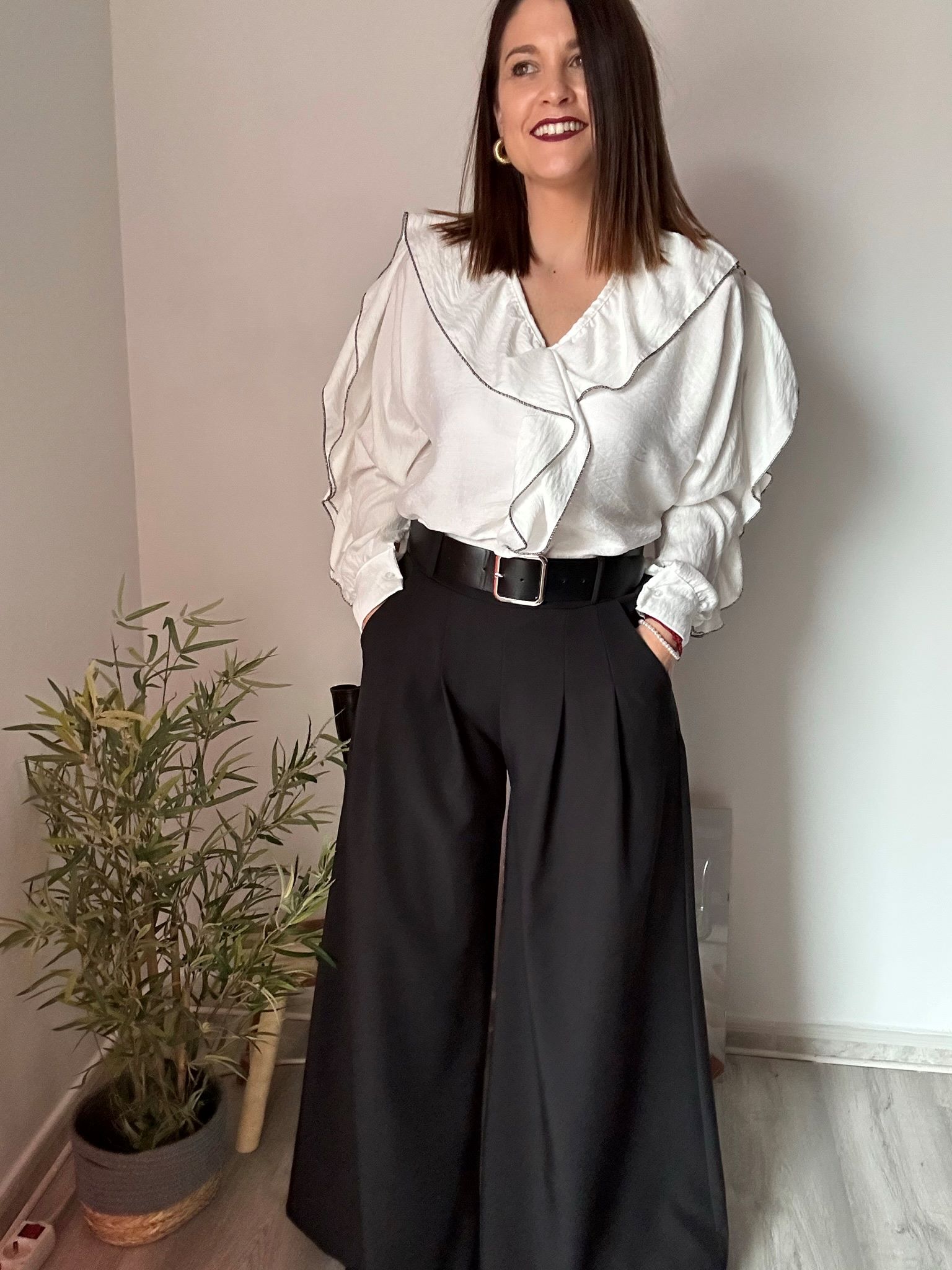 El pantalón en color negro con pinzas y pernera ancha es una prenda versátil, elegante y con ese toque sofisticado que nunca pasa de moda. Su diseño combina comodidad y estilo, convirtiéndose en una pieza imprescindible para cualquier fondo de armario.