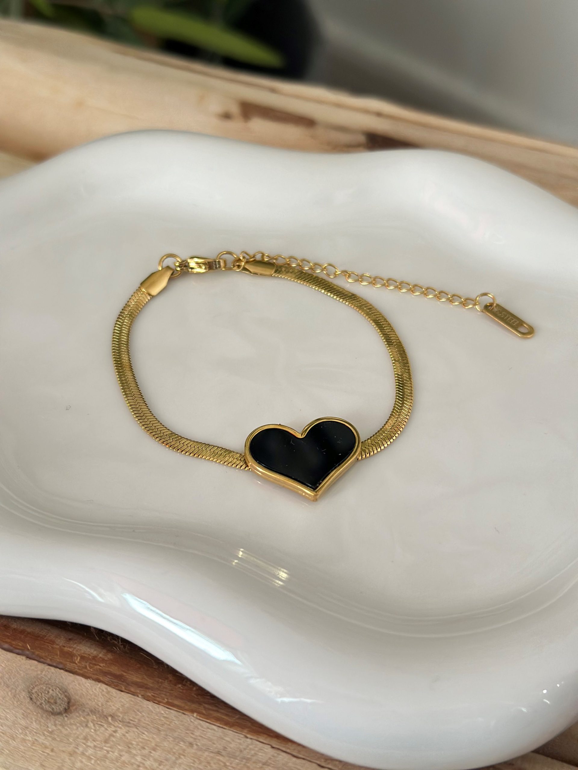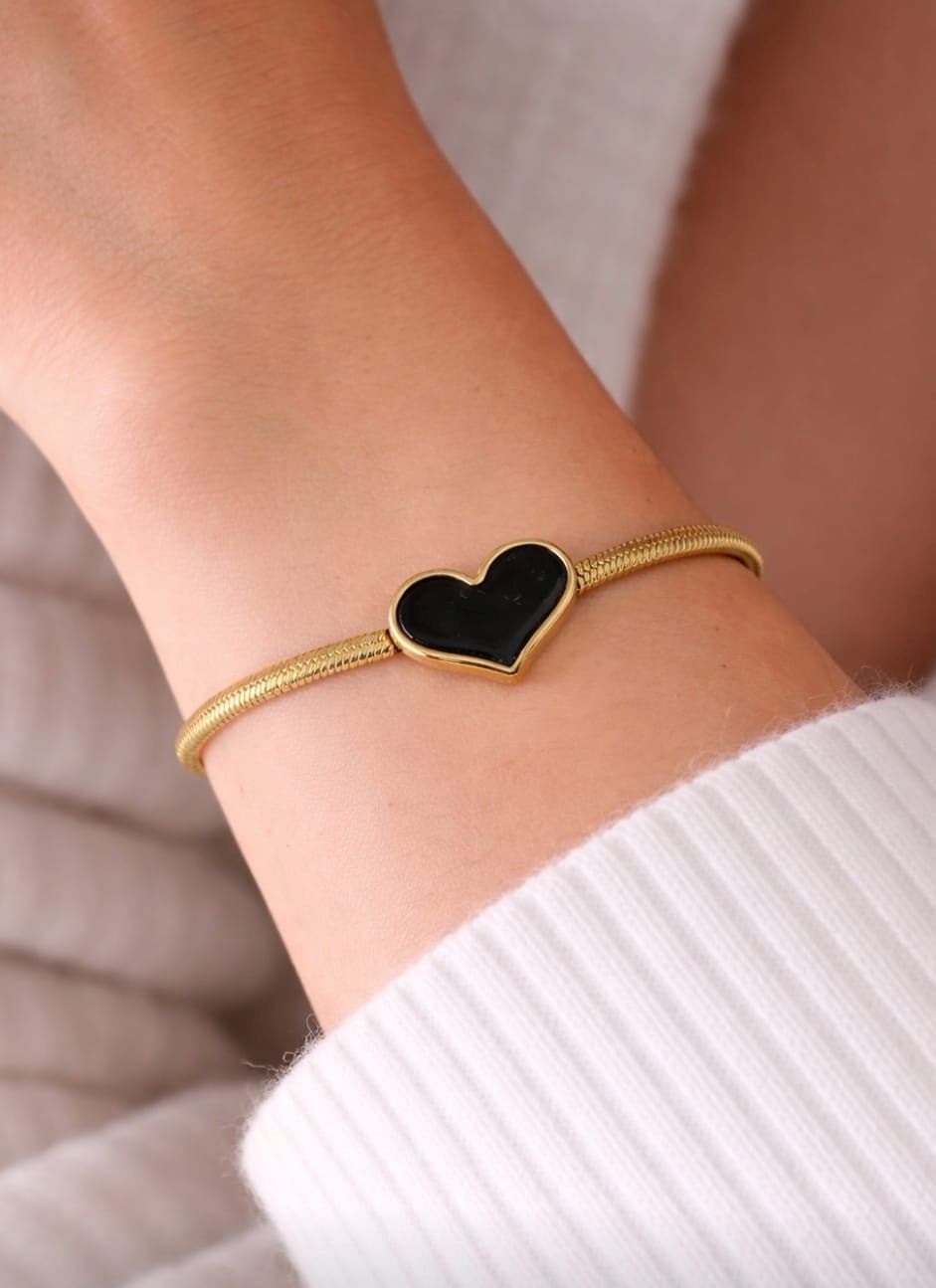 Disponible en nuestra tienda física y online, esta pulsera dorada corazón negro es el accesorio ideal para mujeres que buscan una joya diferente, resistente y con significado.