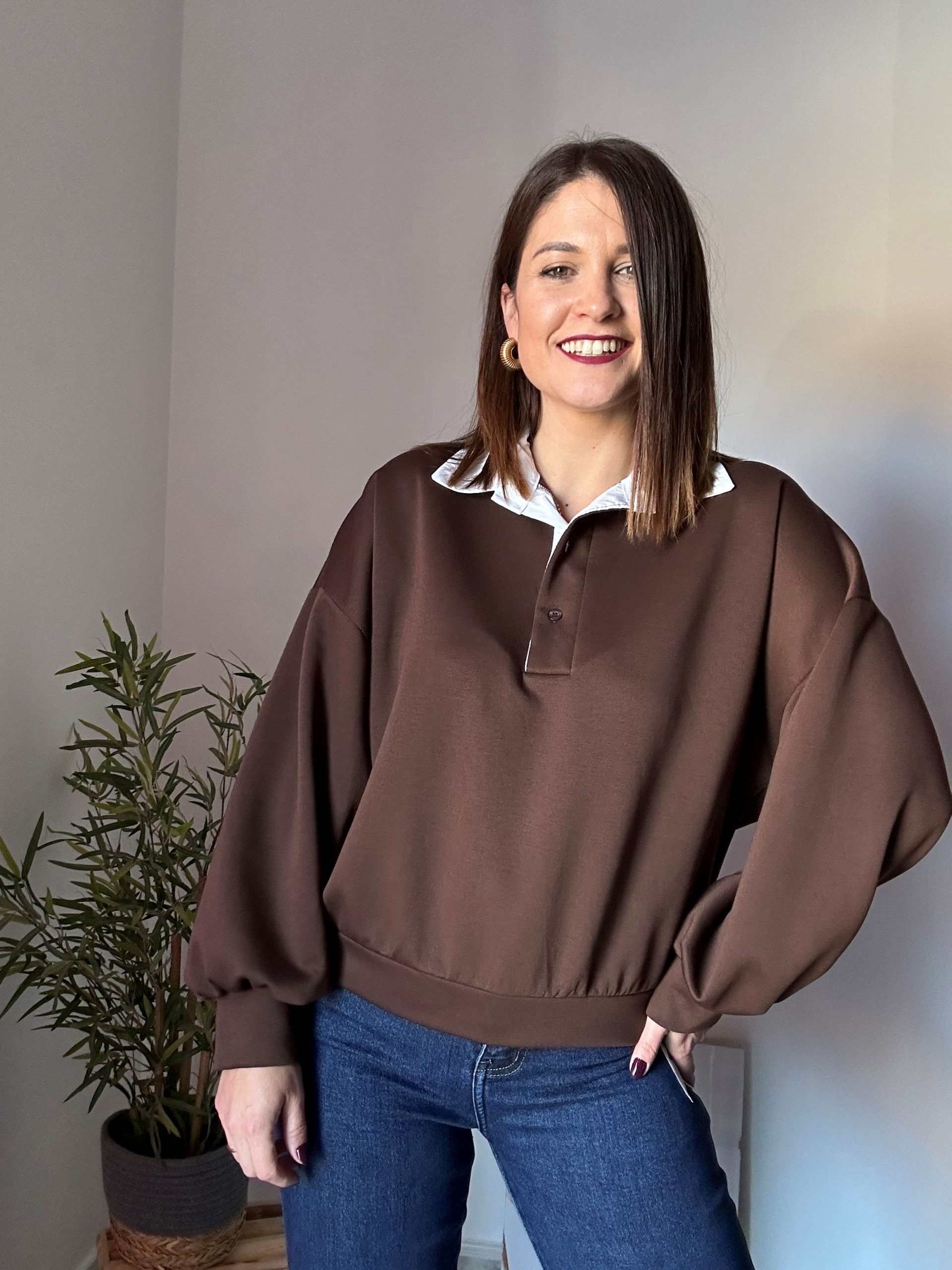 Si buscas una prenda versátil, con estilo atemporal y un tejido que te acompañe con suavidad y elegancia, esta sudadera marrón con cuello camisero será tu aliada perfecta para los días de otoño e invierno.