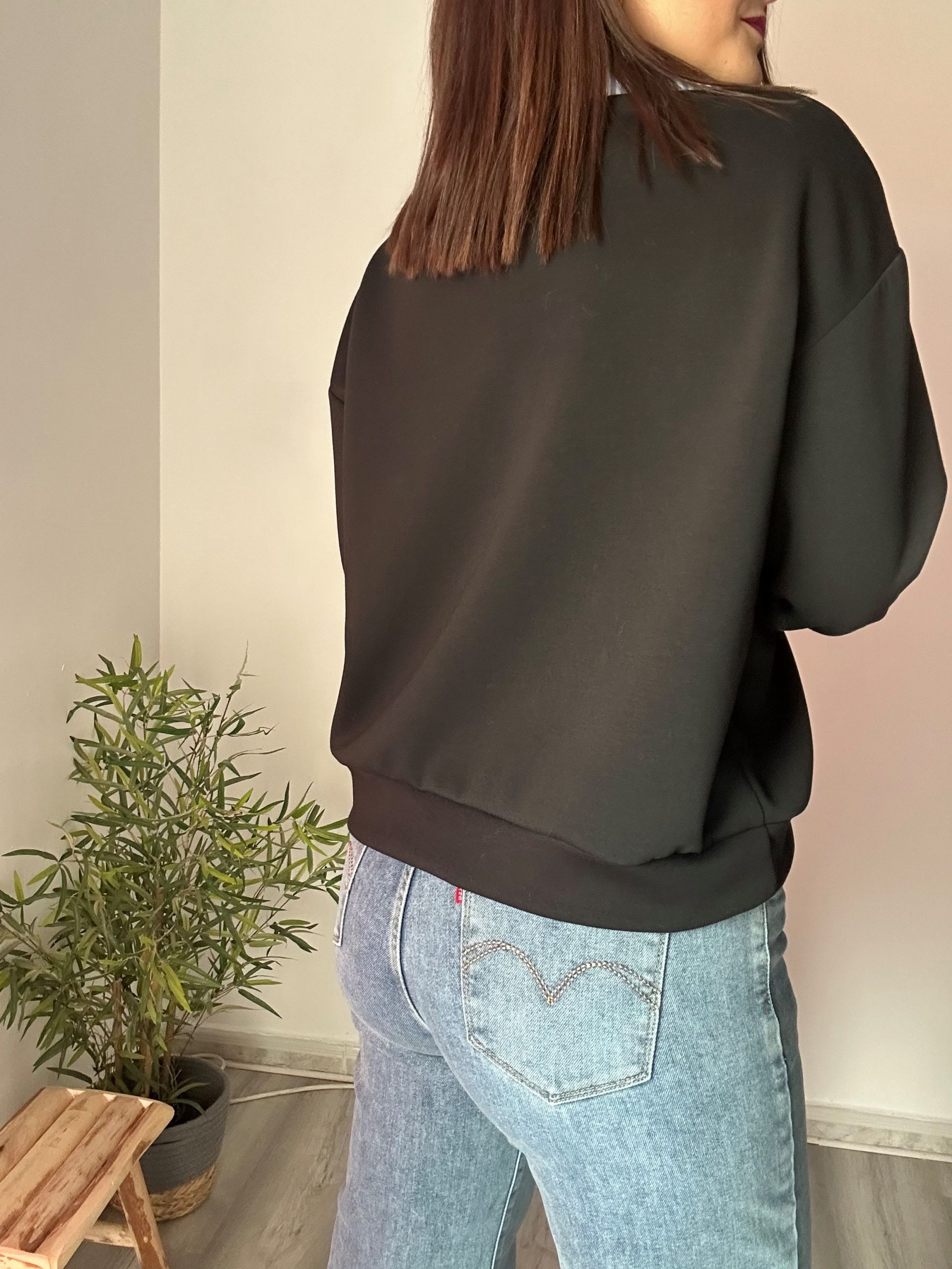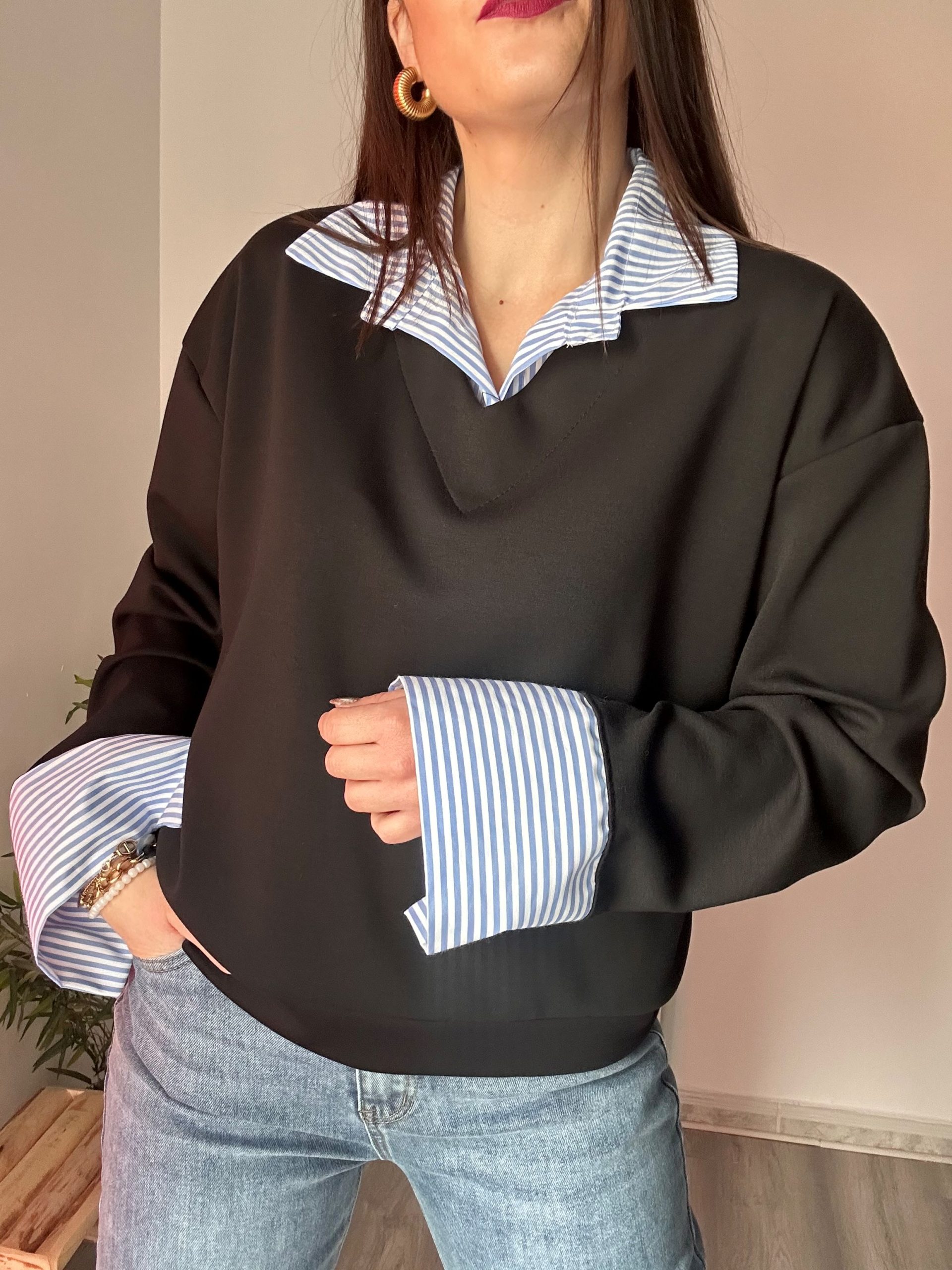 Sudadera negra con puño y cuello de camisa a rayas (azul y blanco)