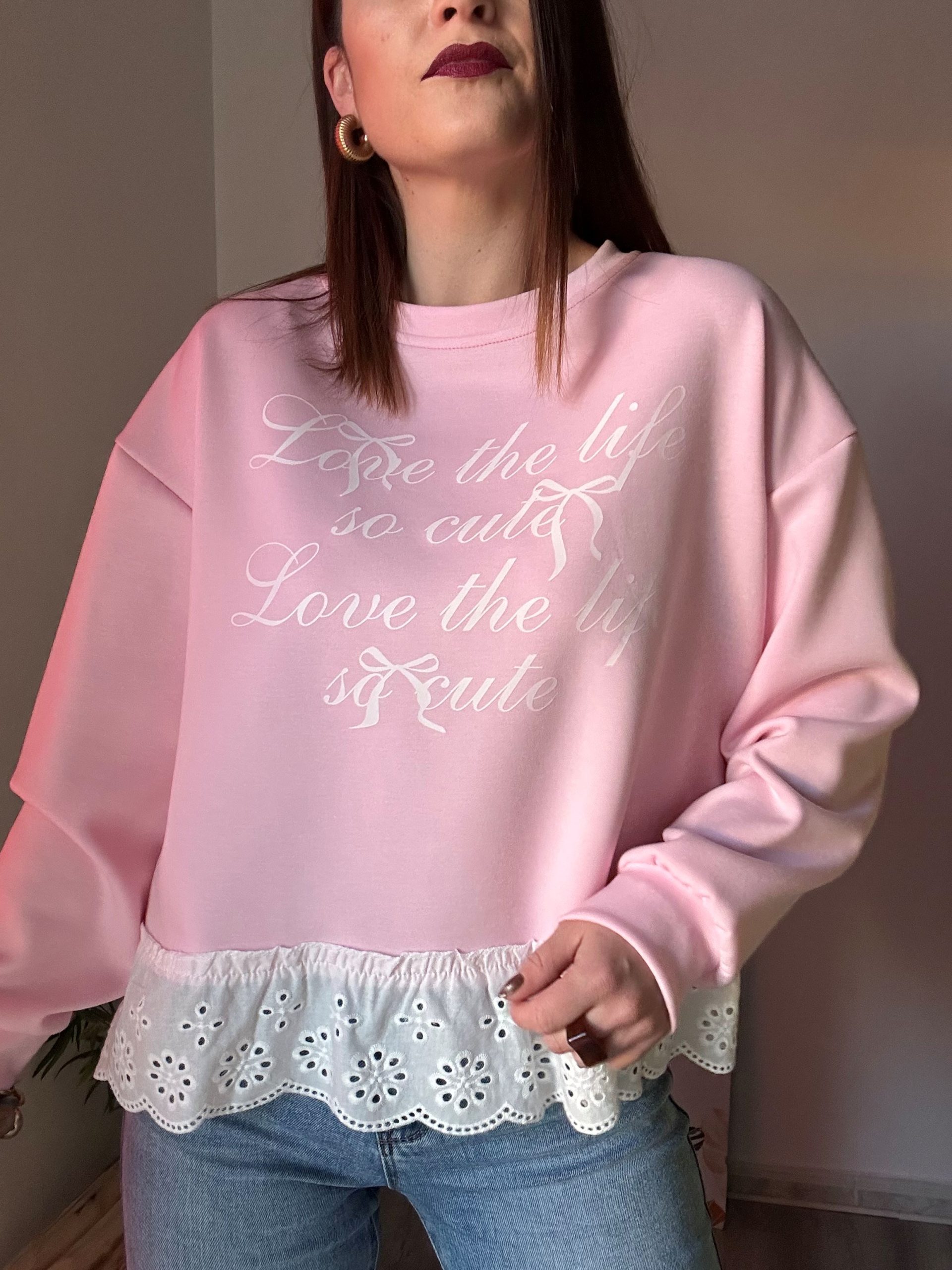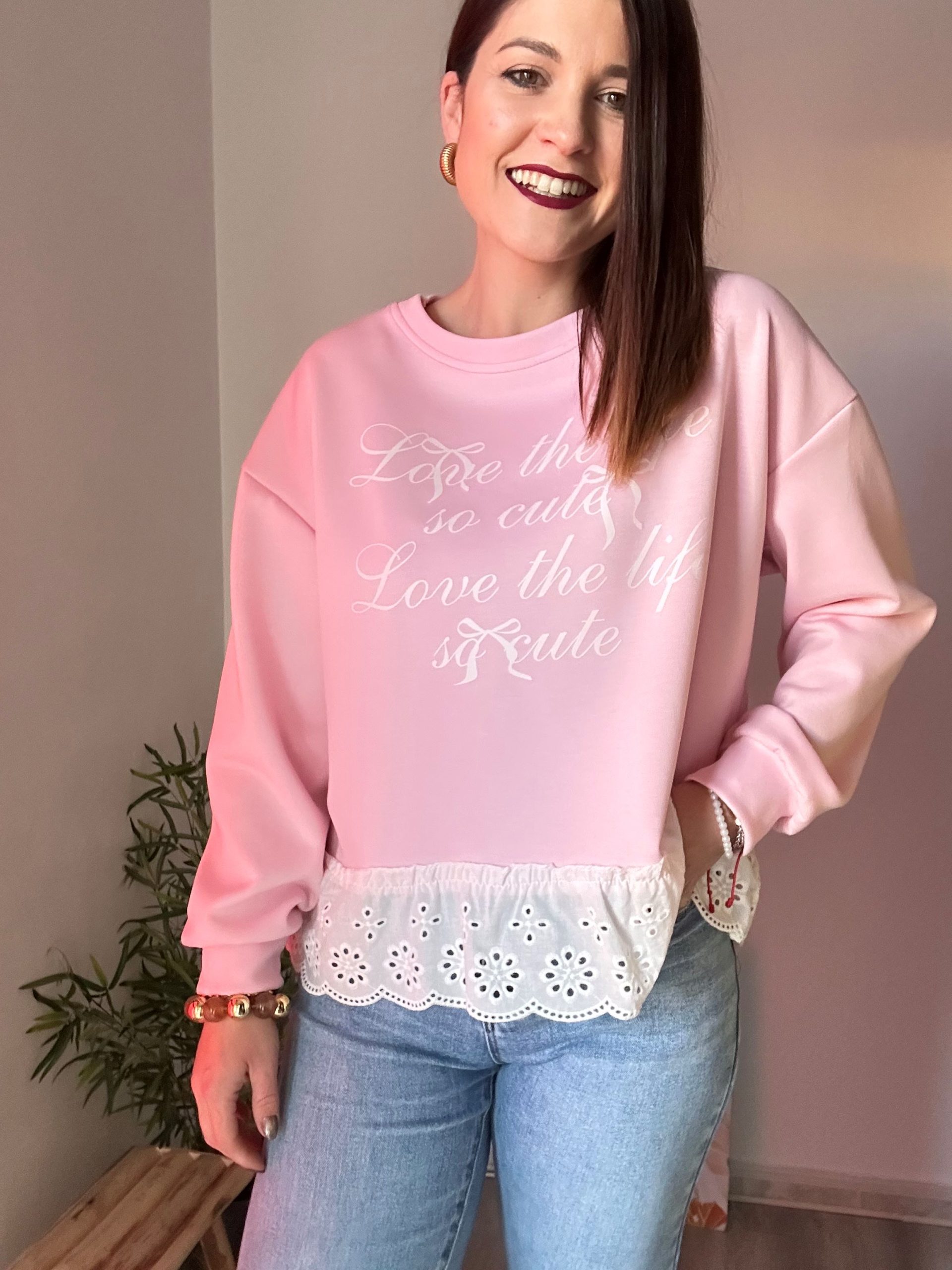 Su delicado tono rosa claro transmite dulzura y frescura, mientras que el detalle de letras blancas aporta un aire moderno y actual. El verdadero protagonista es el volante blanco troquelado en la parte inferior, un acabado femenino y original que eleva esta prenda básica a otro nivel, convirtiéndola en una sudadera distinta y muy estilosa.