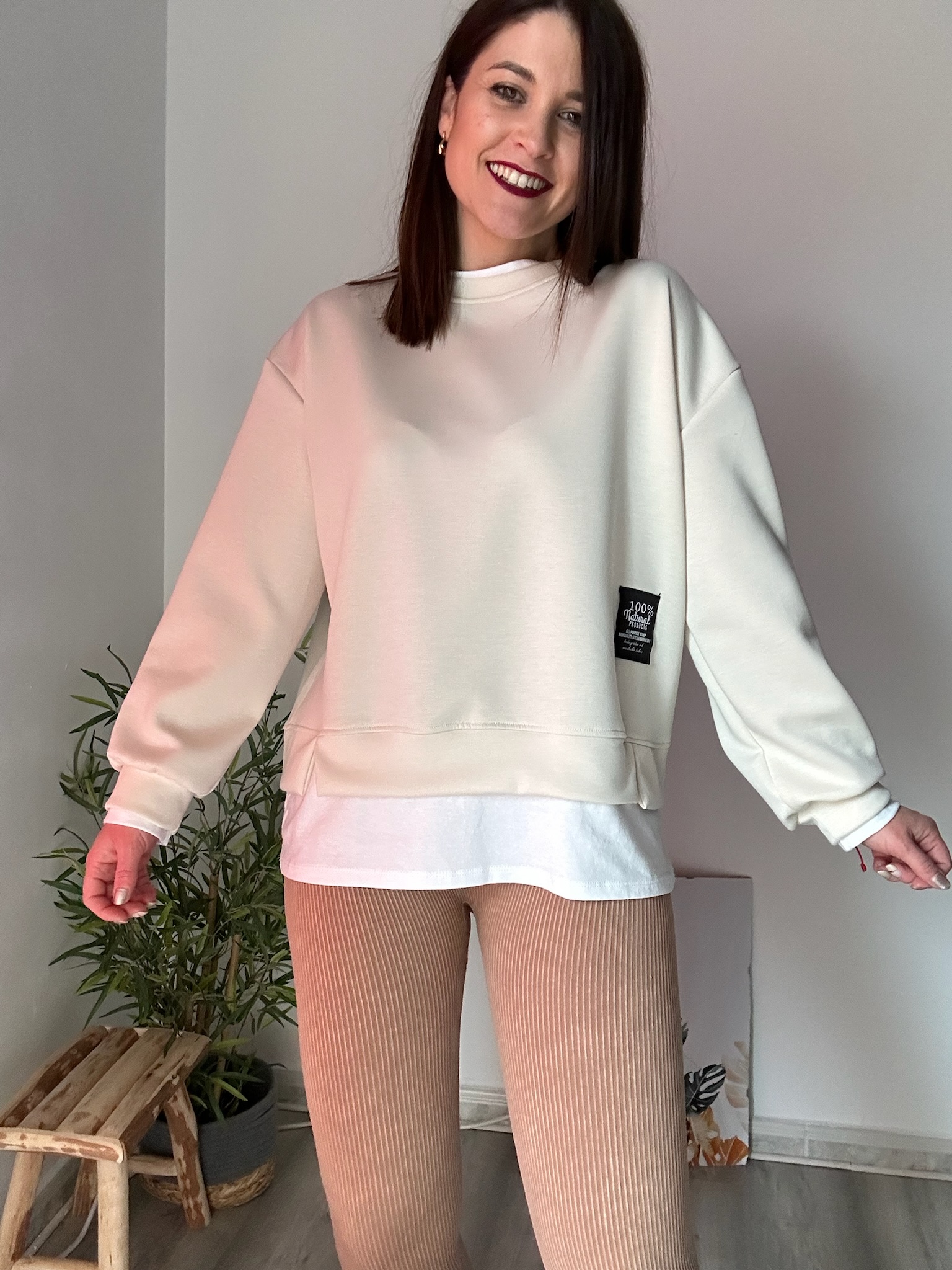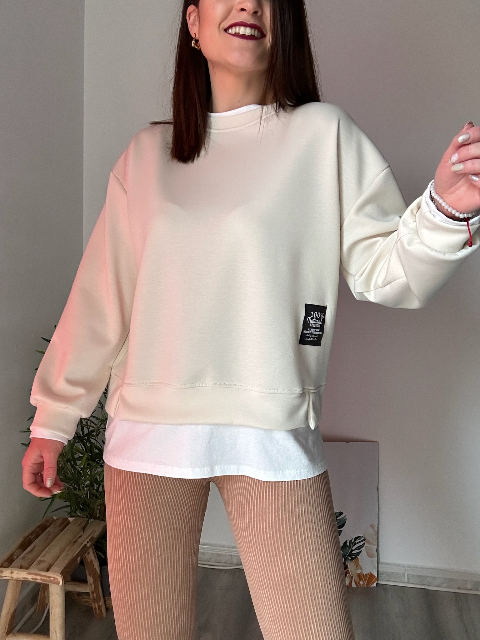 Sudadera color beige de mujer con efecto doble capa simulando camiseta interior. Tejido suave y elástico (35% viscosa, 60% poliéster, 5% elastano). Diseño cómodo y versátil.