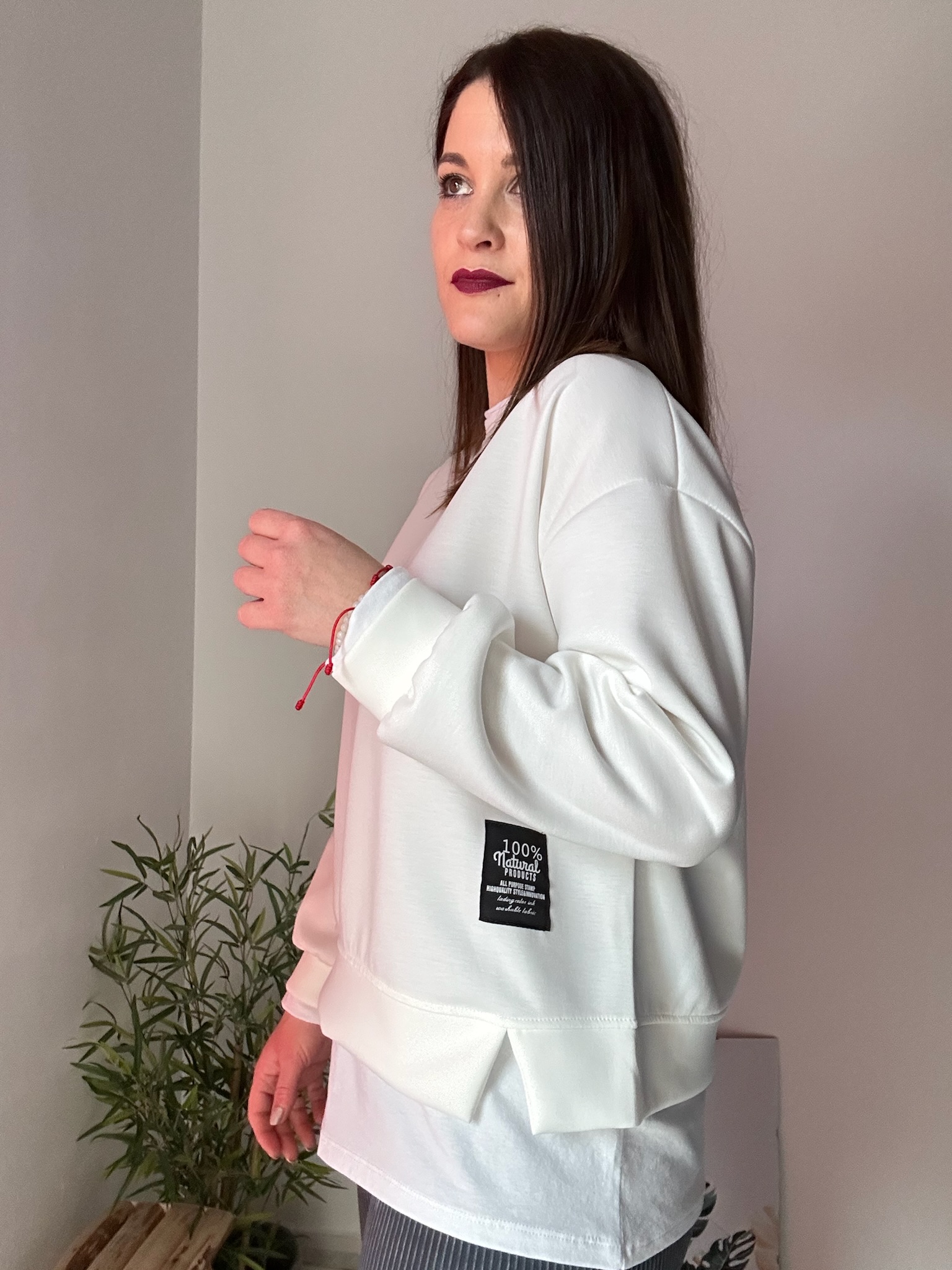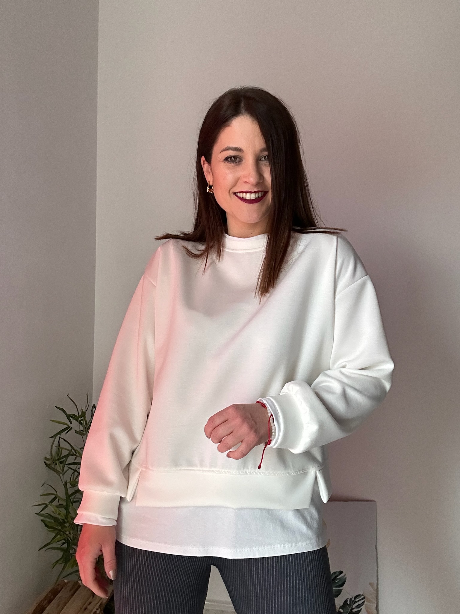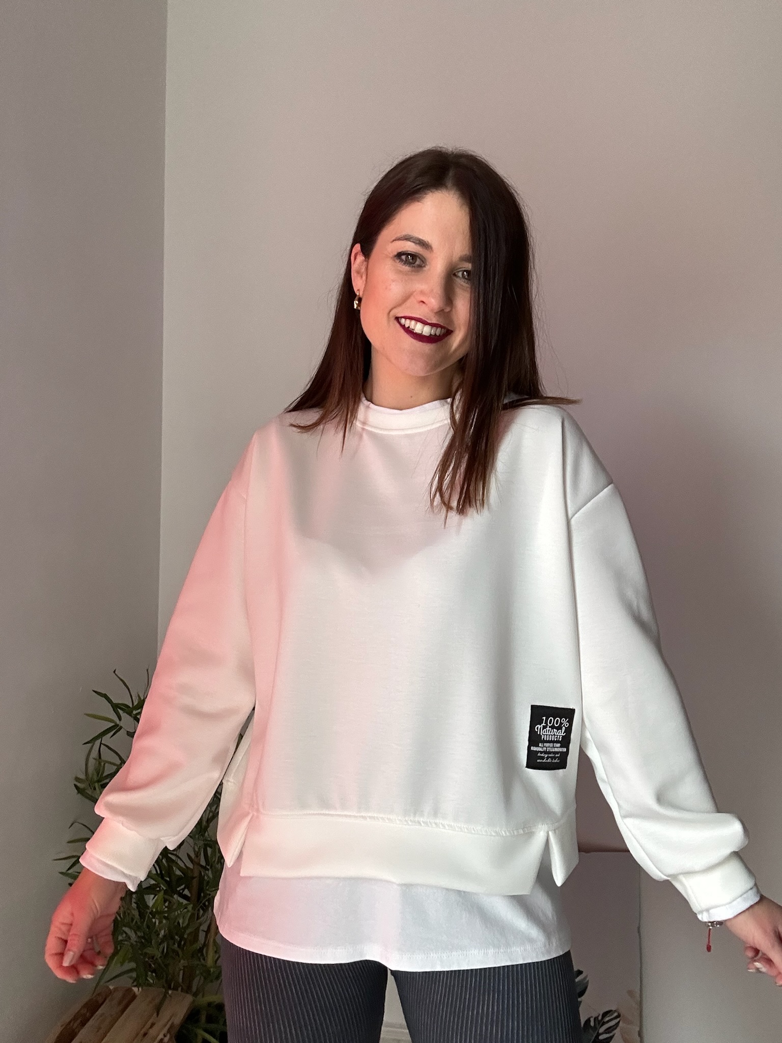 Esta sudadera oversize de mujer es talla única y está recomendada para tallas comprendidas entre la 36 y la 44. Gracias a su patrón amplio y su tejido con elastano, se adapta cómodamente a distintas siluetas.