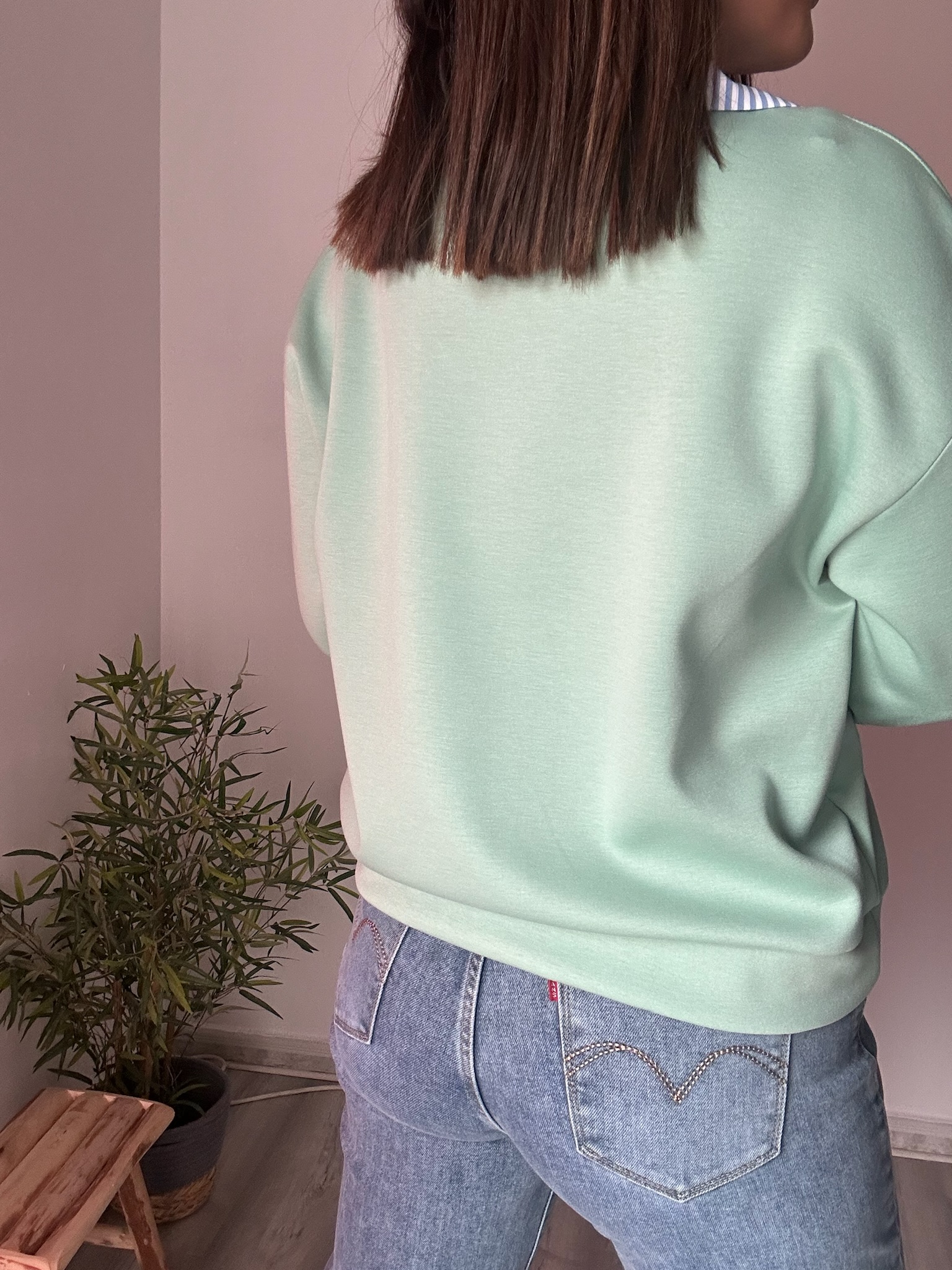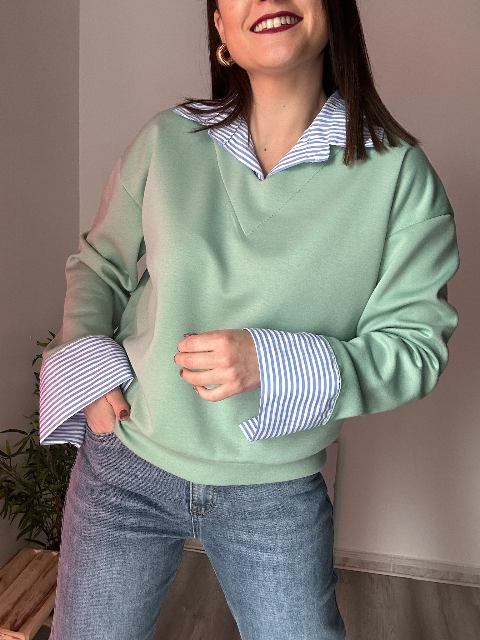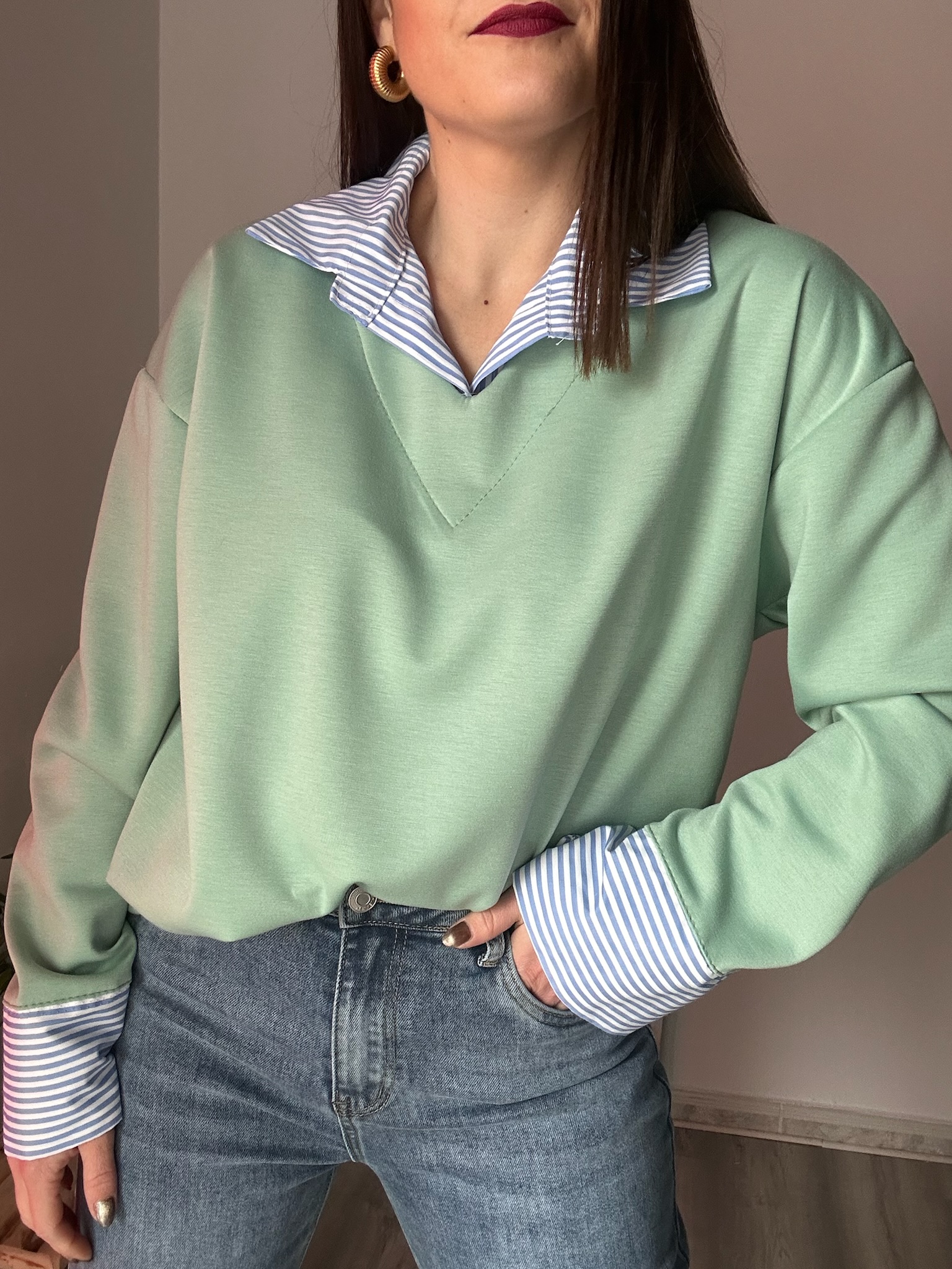 Sudadera verde con puño y cuello de camisa a rayas (azul y blanco)