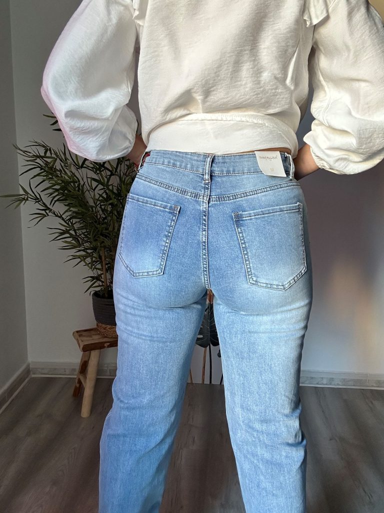 Vaquero en color clarito con bajo vuelto, ideal para adaptarse a la altura de cada mujer. Corte recto, tiro alto y tejido cómodo con algodón, poliéster y elastano.