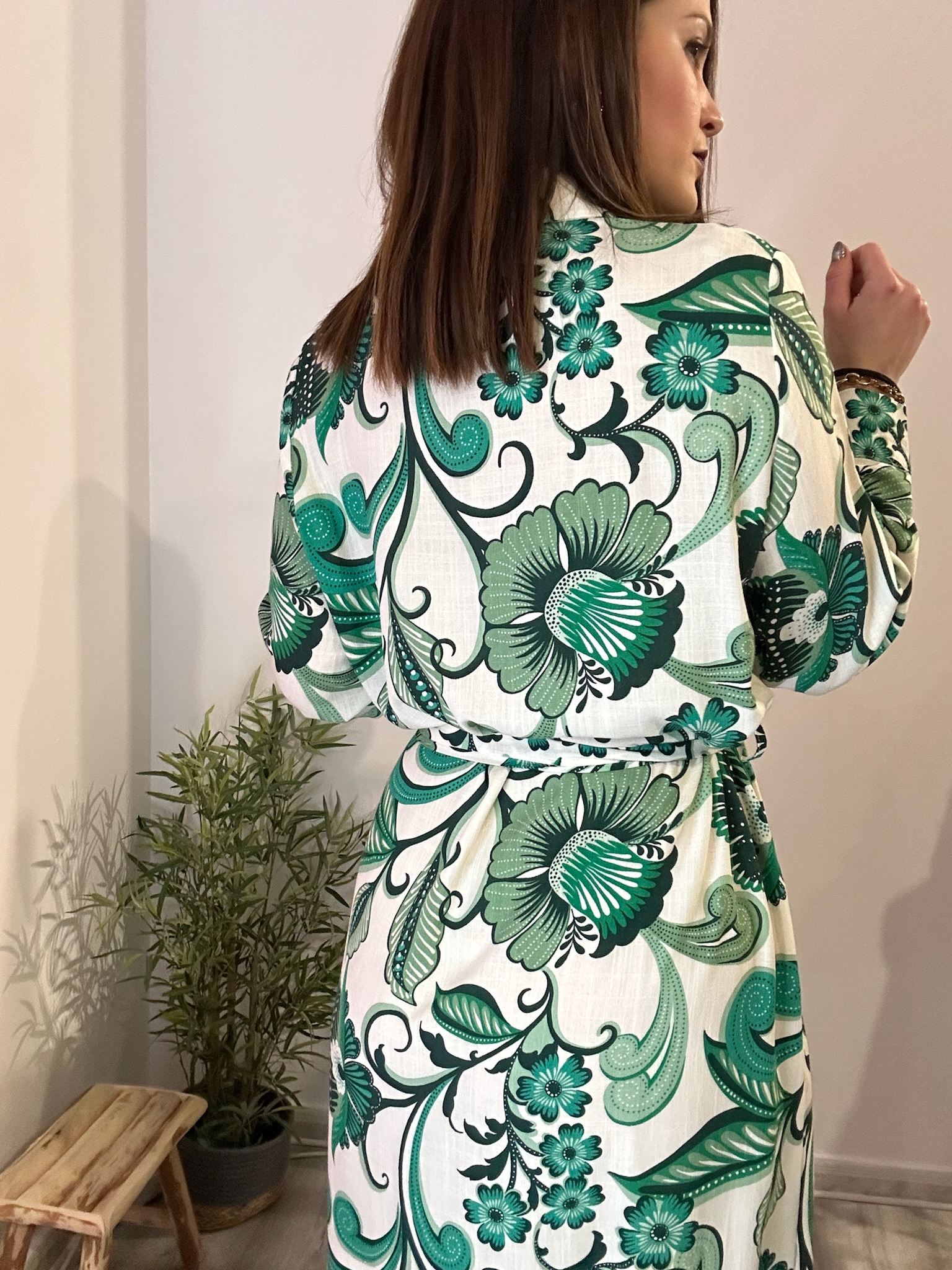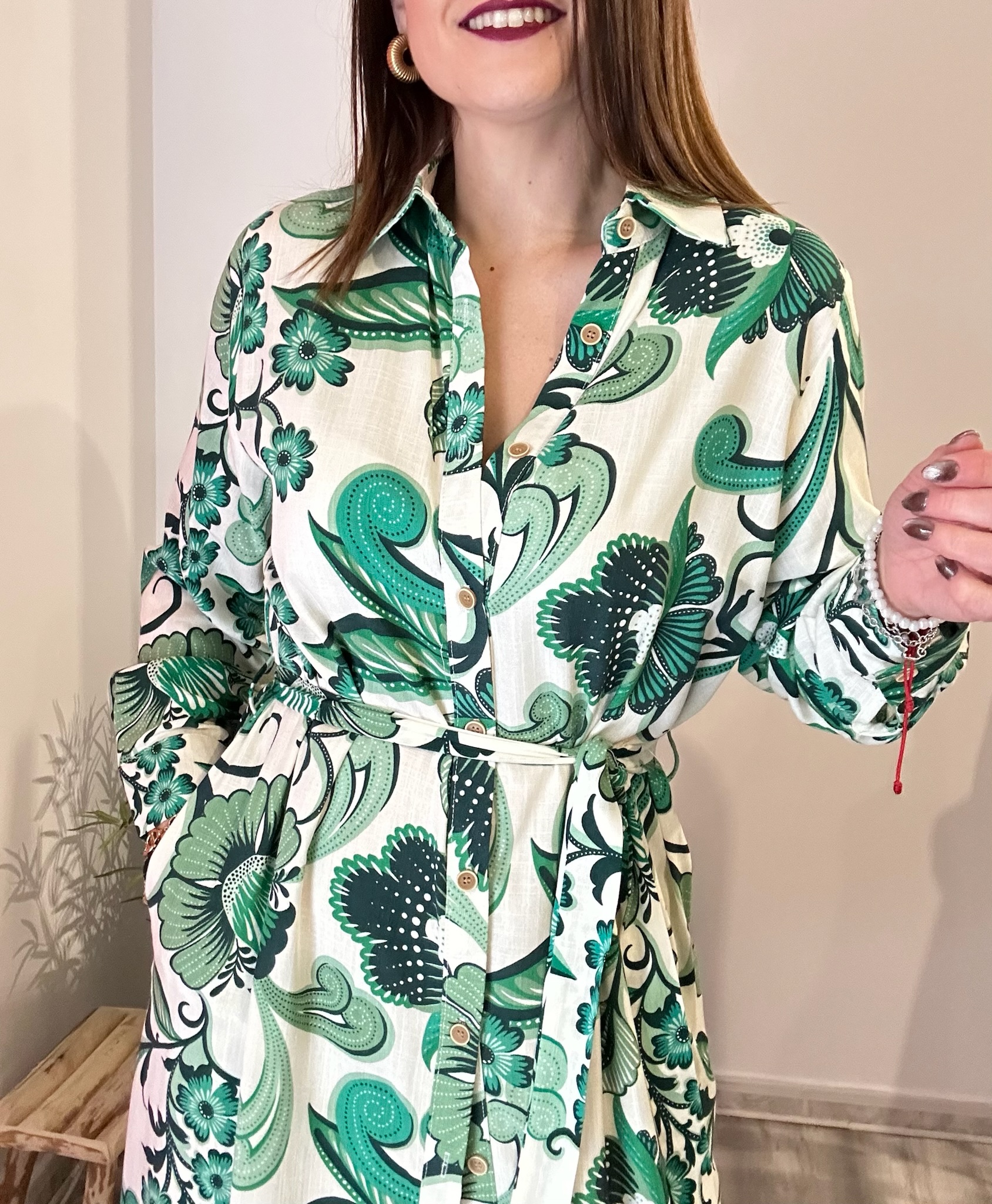 Vestido camisero blanco con flores verdes, cinturón del mismo tejido y bolsillos laterales. Confeccionado en 70% viscosa y 30% nylon, disponible en tallas S-XL. Versátil, elegante y femenino, ideal para looks diarios.