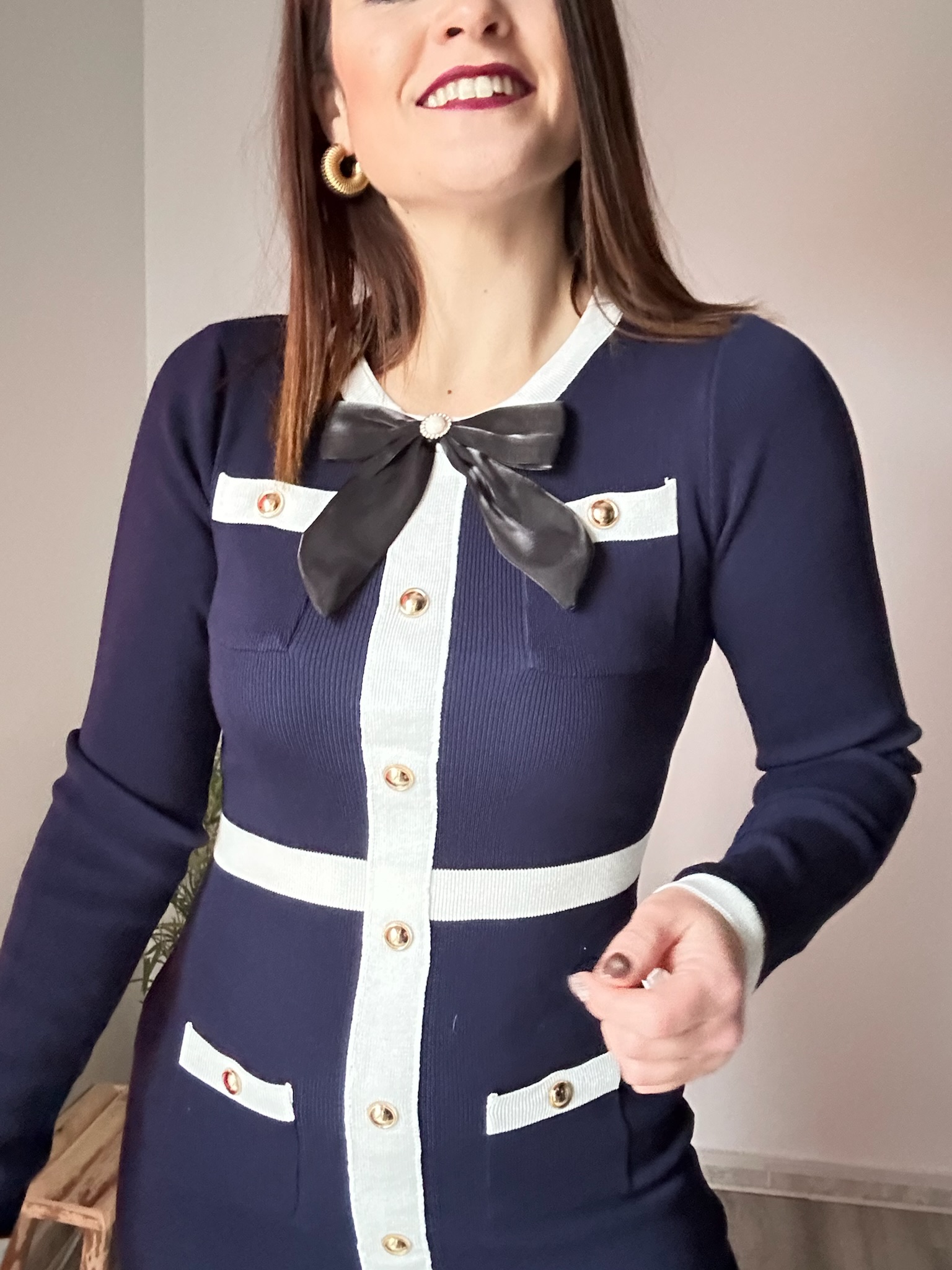 Vestido marinero entubado azul marino con botones dorados y lazo negro en el cuello. Confeccionado en 69% viscosa y 32% nylon. Elegante y sofisticado, ideal para eventos, cenas o reuniones. Prenda versátil y femenina que aporta estilo y comodidad en La Boutique de Virgo.